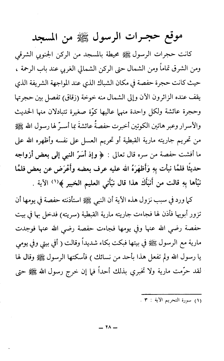 حيث كانت حجرة حفصة في مكان الشباك الذي عند المواجهة الشريفة الذي يقف عنه الزائرون الآن وإلى الشمال منه خوخة (زقاق) تفصل بين حجرتهما وحجرة عائشة ولكل واحدة منهما عاليها كوة صغيرة تتبادلان منها الحديث والأسرار وعبر هاتين الكوتين أخبرت حفصة عائشة بما اسر لها رسول الله صلى الله عليه وسلم من تحريم جاريته مارية القبطية أو تحريم العسل علىنفسه وأظهره الله على ما أفشت حفصة من سره قال تعالى: (وإذا أسر النبي إلى بعض أزواجه حديثاً فلما نبأت به وأظهره الله عليه عرف بعضه وأعرض عن بعض فلما نبأها به قالت من أنبأك هذا قال نبأني العليم الخبير) (1) الآية.