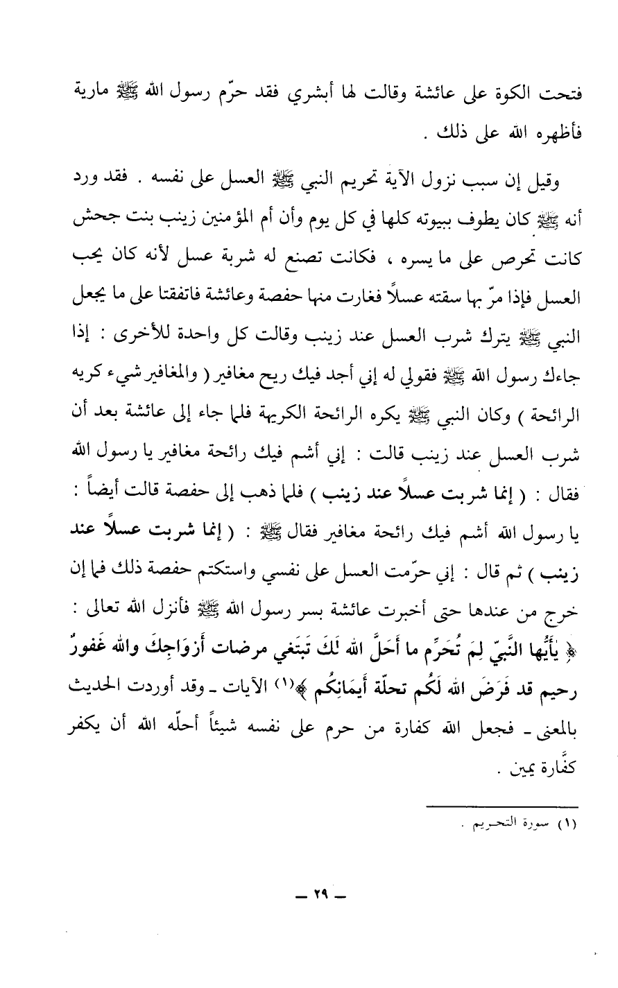 فقد ورد أنه صلى الله عليه وسلم كان يطوف ببيوته كلها في كل يوم وأن أم المؤمنين زينب بنت جحش كانت تحرص على ما يسره، فكانت تصنع له شربة عسل لأنه كان يحب العسل فإذا مر بها سقته عسلاً فغارت منها حفصة وعائشة فاتفقتا على ما يجعل النبي صلى الله عليه وسلم يترك شرب العسل عند زينب وقالت كل واحدة للأخرى: إذا جاءك رسول الله صلى الله عليه وسلم فقولي له إني أجد فيك ريح مغافير (والمغافير شيء كريه الرائحة) وكان النبي صلى الله عليه وسلم يكره الرائحة الكريهة فلما جاء إلى عائشة بعد أن شرب العسل عند زينب قالت: إني اشم فيك رائحة مغافير يا رسول الله فقال: (إنما شربت عسلاً عند زينب) فلما ذهب إلى حفصة قالت أيضاً: يا رسول الله أشم فيك رائحة مغافير فقال ص: (إنما شربت عسلاً عند زينب) ثم قال: إني حرمت العسل على نفسي واستكتم حفصة ذلك فما إن خرج من عندها حتى أخبرت عائشة بسر رسول الله صلى الله عليه وسلم فأنزل الله تعالى: (يأيها النبي لم تحرم ما أحل الله لك تبتغي مرضات أزواجك والله غفور رحيم قد فرض الله لكم تحلة أيمانكم) (1) الآيات - وقد أوردت الحديث بالمعنى - فجعل الله كفارة من حرم على نفسه شيئاً أحله الله أن يكفر كفارة يمين.