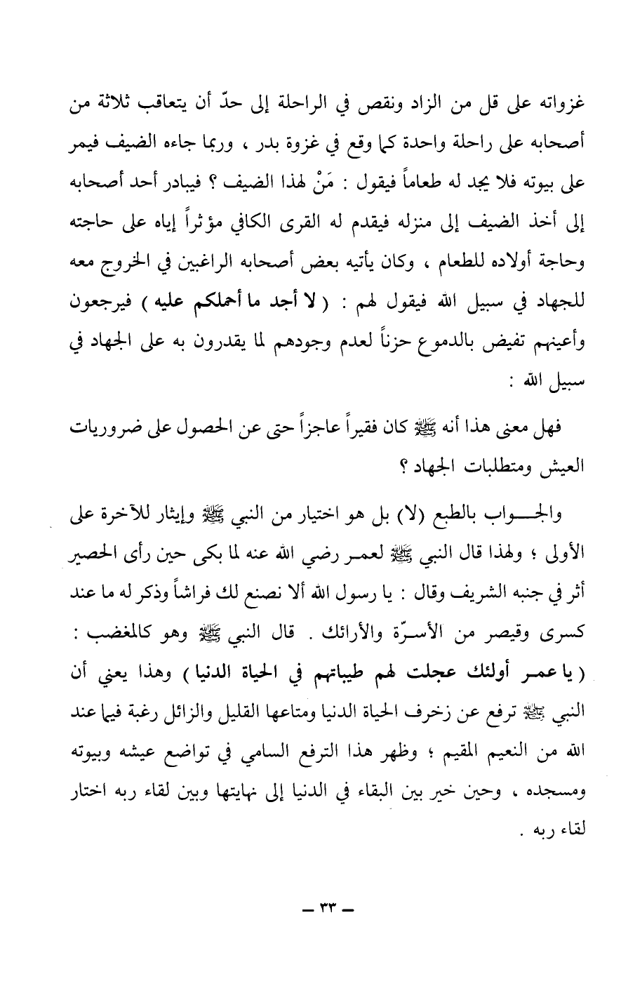 غزواته على قل من الزاد ونقص في الراحلة إلى حد أن يتعاقب ثلاثة من أصحابه على راحلة واحدة كما وقع في غزوة بدر، وربما جاءه الضيف فيمر هلى بيوته فلا يجد له طعاماً فيقول: من لهذا الضيف؟ فيبادر أحد أصحابه غلى أخذ الضيف إلىمنزله فيقدم له القرى الكافي مؤثراً إياه على حاجته وحاجة أولاده للطعام، وكان يأتيه بعض أصحابه الراغبين في الخروج معه للجهاد في سبيل الله فيقول لهم: (لا أجد ما أحملكم عليه) فيرجعون وأعينهم تفيض بالدموع حزناص لعدم وجودهم لما يقدرون به على الجهاد في سبيل الله: فهل معنى هذا أنه صلى الله عليه وسلم كان فقيراً عاجزاص حتى عن الحصول على ضروريات العيش ومتطلبات الجهاد؟ والجواب بالطبع (لا) بل هو اختيار من النبي صلى الله عليه وسلم وإيثار للآخرة على الأولى، ولهذا قال النبي صلى الله عليه وسلم لعمر رضي الله عنه لما بكى حين رأى الحصير أثر في جنبه الشريف وقال: يا رسول الله ألا نصنع لك فراشاً وذكر له ما عند كسرى وقيصر من الأسرة والأرائك.
