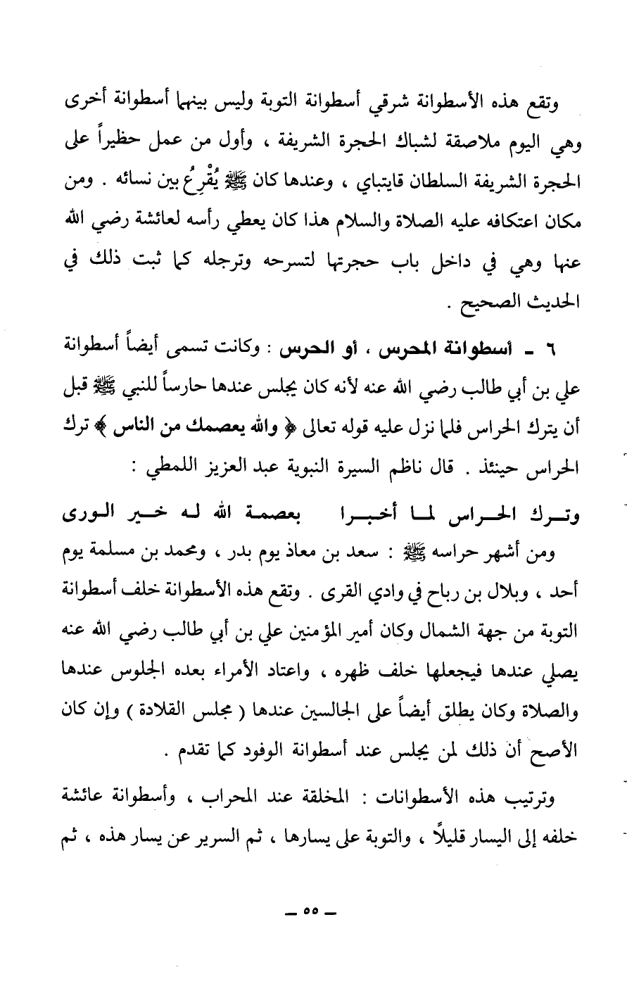 55…وتقع هذه الأسطوانة شرقي اسطوانة التوبة وليس بينهما اسطوانة أخرى وهي اليوم ملاصقة لشباك الحجرة الشريفة، وأول من عمل حظيراً على الحجرة الشريفة السلطان قايتباي، وعندها كان صلى الله عليه وسلم يفرق بين نسائه.