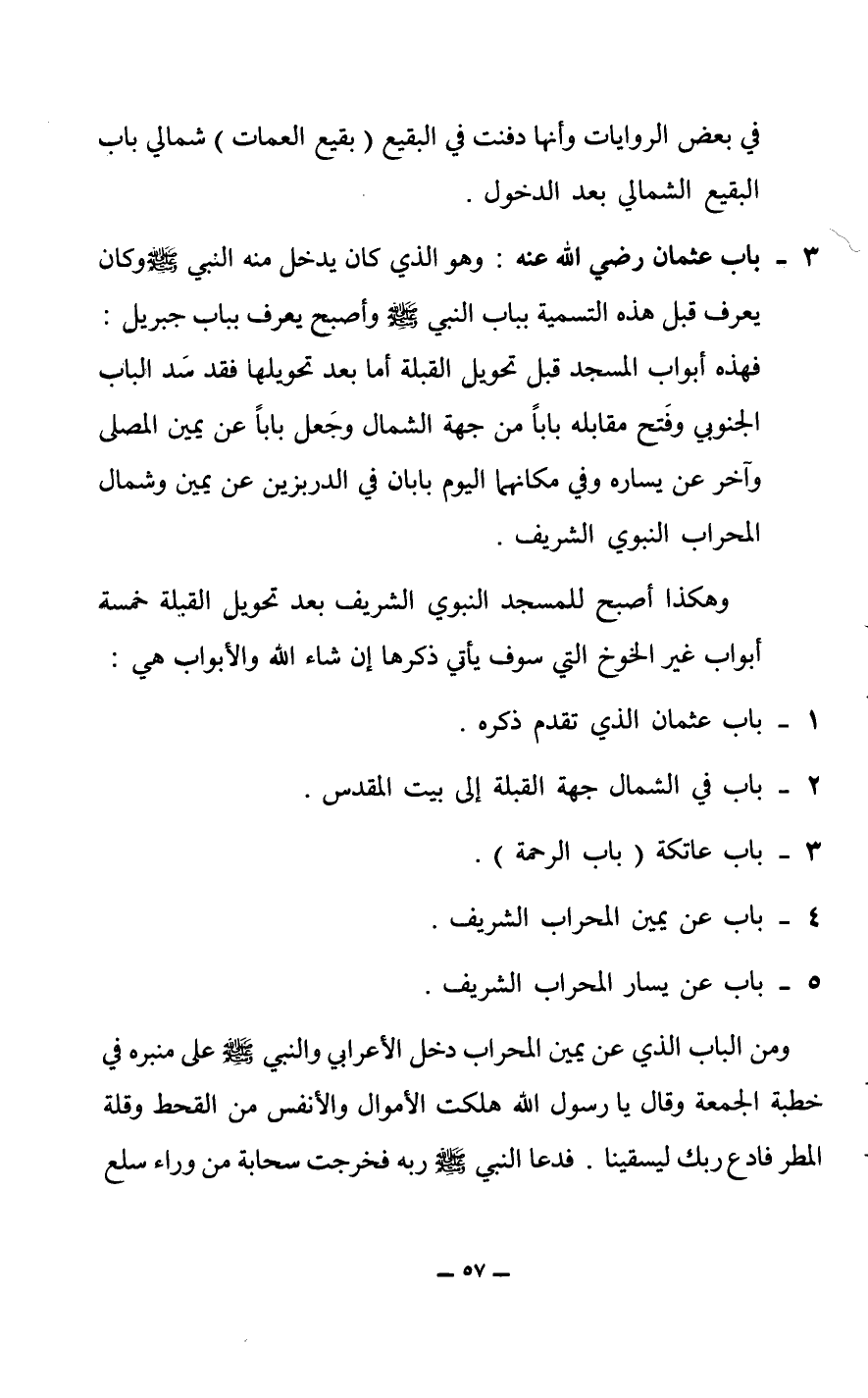 وهكذا اصبح للمسجد النبوي الشريف بعد تحويل القبلة خمسة ابواب غير الخوخ التي سوف يأتي ذكرها إن شاء الله والأبواب هي: