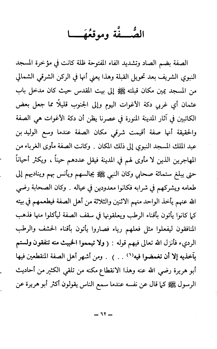 وكانت الصفة مأوى الغرباء من المهاجرين الذين لا مأوى لهم في المدينة فيقل عددهم حيناً، ويكثر أحياناً حتى يبلغ ستمائة صحابي وكان النبي صلى الله عليه وسلم يجالسهم ويأنس بهم ويناديهم إلى طعامه ويشركهم في شرابه فكانوا معدودين في عياله.