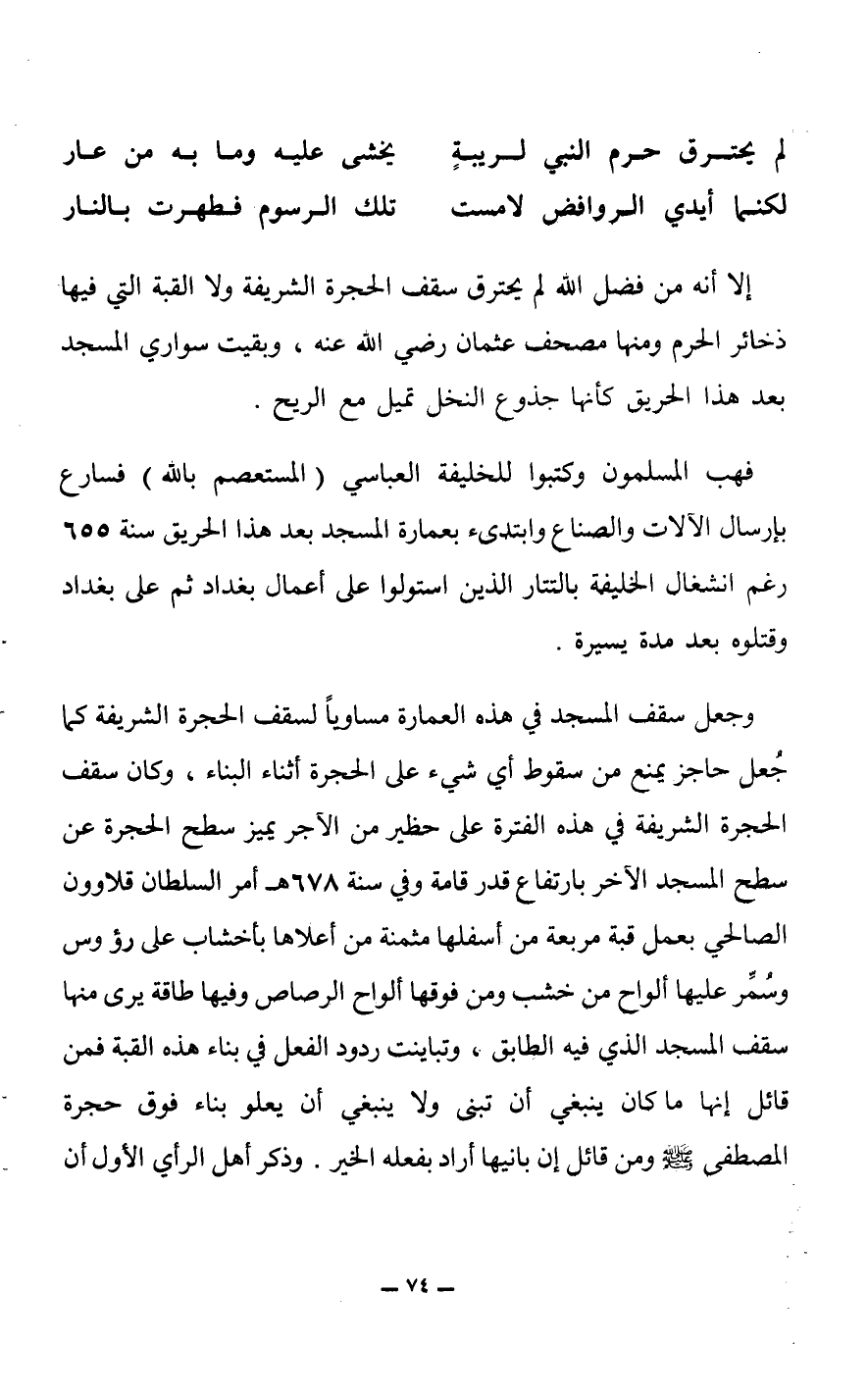 إلا أنه من فضل الله لم يحترق سقف الحجرة الشريفة ولا القبة التي فيها ذخائر الحرم ومنها مصحف عثمان رضي الله عنه، وبقيت سواري المسجد بعد هذا الحريق كأنها جذوع النخل تميل مع الريح.