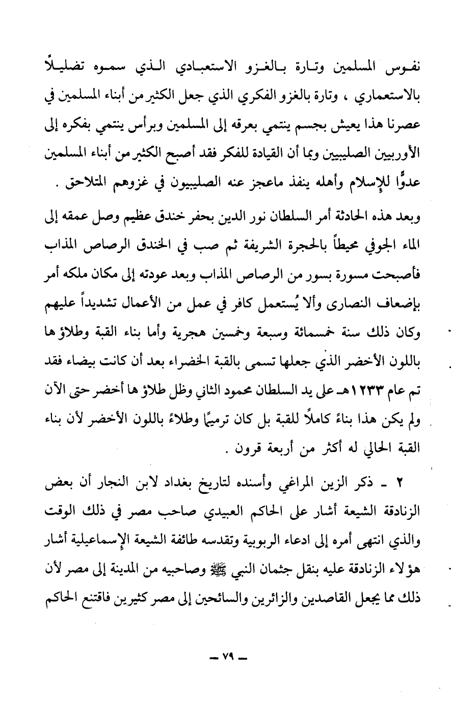 نفوس المسلمين وتارة بالغزو الاستعبادي الذي سموه تضليلاً بالاستعماري، وتارة بالغزو الفكري الذي جعل الكثير من أبناء المسلمين في عصرنا هذا يعيش بجسم ينتمي بعرقه إلى المسلمين وبرأس ينتمي بفكره إلى الأوربيين الصليبيين وبما أن القيادة للفكر فقد أصبح الكثير من أبناء المسلمين عدواً للإسلام وأهله ينفذ ما عجز عنه الصليبيون في غزوهم المتلاحق.