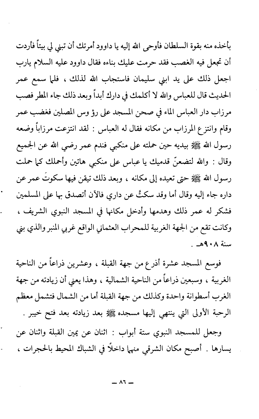 بأخذه منه بقوة السلطان فأوحى الله إليه يا داوود أمرتك أن تبني لي بيتاً فأردت أن تجعل فيه الغصب فقد حرمت عليك بناءه فقال داوود عليه السلام يا رب اجعل ذلك على يد ابني سليمان فاستجاب الله لذلك، فلما سمع عمر الحديث قال للعباس والله لا أكلمك في دارك أبداً وبعد ذلك جاء المطر فصب مرزاب دار العباس الماء في صحن المسجد على رؤوس المصلين فغضب عمر وقام وانتزع المرزاب من مكانه فقال له العباس: لقد انتزعت مرزاباً وضعه رسول الله صلى الله عليه وسلم بييه حين حملته على منكبي فندم عمر رضي الله عن الجميع وقال: والله لنضعن قدميك يا عباس على منكبي هاتين وأحملك كما حملت رسول الله صلى الله عليه وسلم حتى تعيده إلى مكانه، وبعد ذلك تيقن فيها سكوت عمر عن داره جاء إليه وقال أما وقد سكت عن داري فالآن أتصدق بها على المسلمين فشكر له عمر ذلك وهدمها وأدخل مكانها في المسجد النبوي الشريف، وكانت تقع من الجهة الغربية للمحراب العثماني الواقع غربي المنبر والذي بنى سنة 908 هـ.