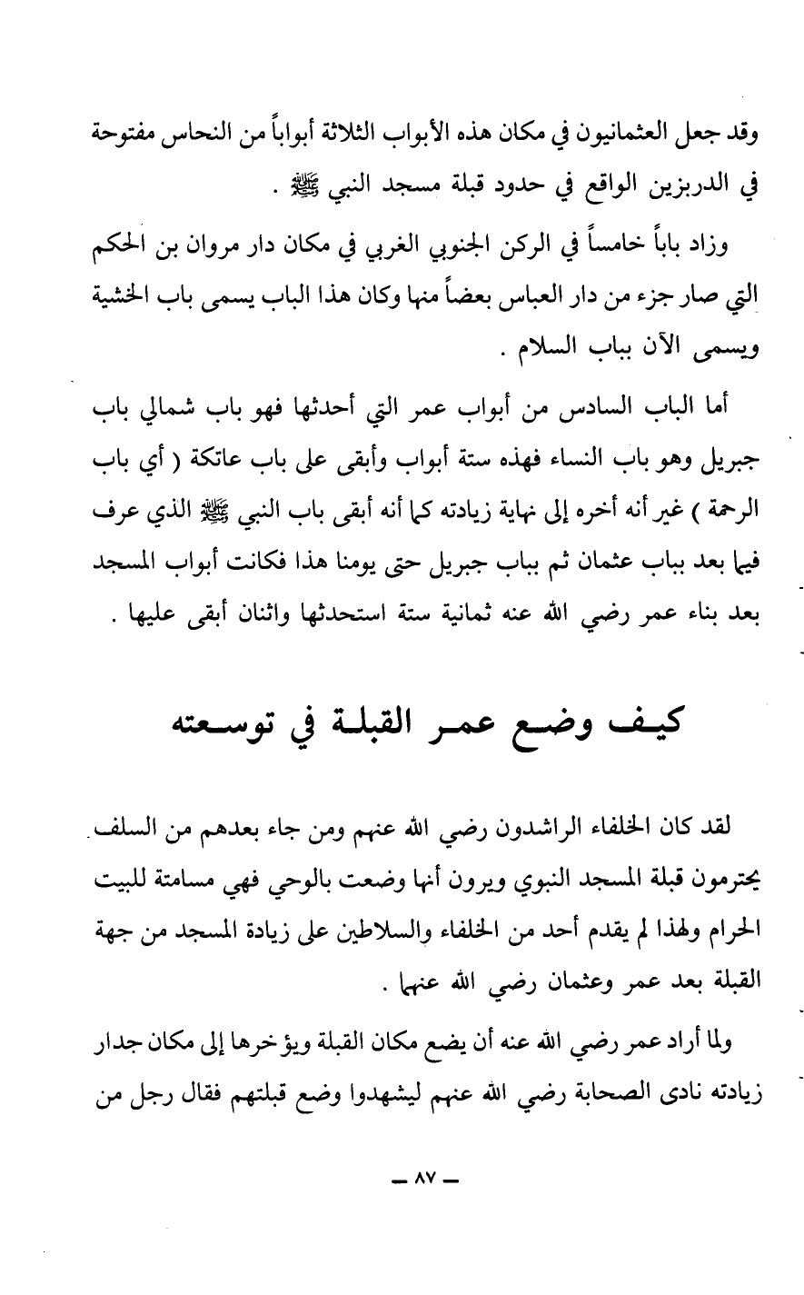 لقد كان الخلفاء الراشدون رضي الله عنهم ومن جاء بعدهم من السلف يحترمون قبلة المسجد النبوي ويرون أنها وضعت بالوحي فهي مسامته للبيت الحرام ولهذا لم يقدم أحد من الخلفاء والسلاطين على زيادة المسجد من جهة القبلة بعد عمر وعثمان رضي الله عنهما.