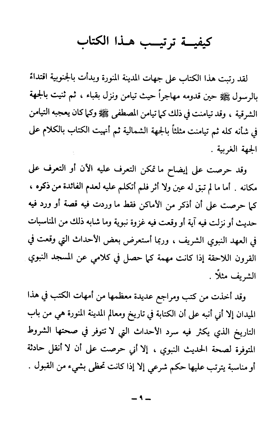 لقد رتبت هذا الكتاب على جهات المدينة المنورة وبدأت بالجنوبية اقتداءً بالرسول صلى الله عليه وسلم حين قدومه مهاجراً حيث تيامن ونزل بقباء، ثم ثنيت بالجهة الشرقية، وقد تيامنت في ذلك كما تيامن المصطفى ص وكما كان يعجبه التيامن في شأنه كله ثم تيامنت مثلثاً بالجهة الشمالية ثم أنهيت الكتاب بالكلام على الجهة الغربية.