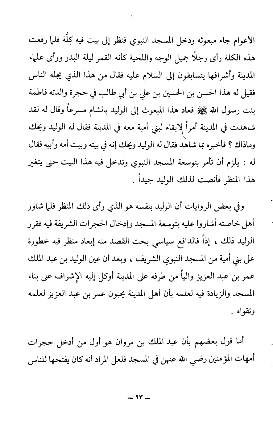 الأعوام جاء مبعوثه ودخل المسجد النبوي فنظر إلى بيت فيه كله فلما رفعت هذه الكلة رأى رجلاً جميل الوجه واللحية كأنه القمر ليلة البدر ورأى علماء المدينة وأشرافها يتسابقون إلى السلام عليه فقال من هذا الذي يجله الناس فقيل له هذا الحسن بن الحسين بن علي بن ابي طالب في حجرة والدته فاطمة بنت رسول الله صلى الله عليه وسلم فعاد هذا المبعوث إلى الوليد ويحك إنه في بيته وبيت أمه وأبيه فقال له: يلزم أن تأمر بتوسعة المسجد النبوي وتدخل فيه هذا البيت حتى يتغير هذا المنظر فأنصت لذلك الوليد جيداً.