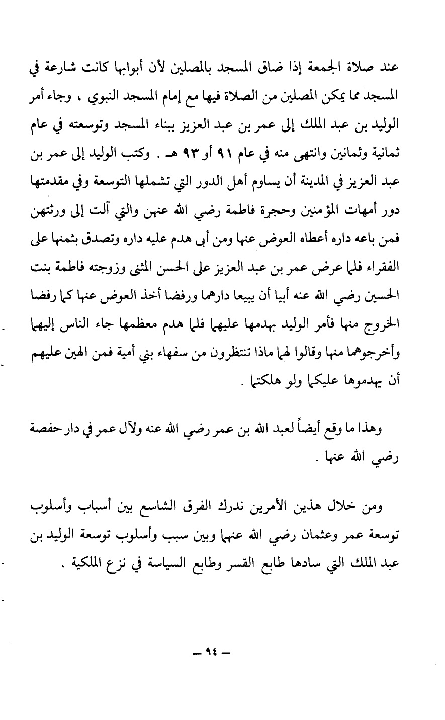ومن خلال هذيه الأمرين ندرك الفرق الشاسع بين أسباب وأسلوب توسعة عمر وعثمان رضي الله عنهما وبين سبب وأسلوب توسعة الوليد بن عبد الملك التي سادها طابع القسر وطابع السياسة في نزع الملكية.