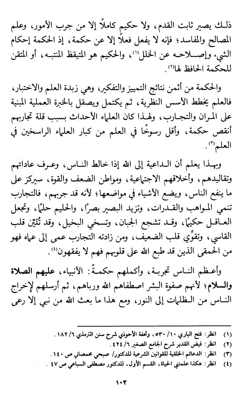 وبهذا يعلم أن الداعية إلى الله إذا خالط الناس، وعرف عاداتهم وتقاليدهم، وأخلاقهم الاجتماعية، ومواطن الضعف والقوة، سيركز على ما ينفع الناس، ويضع الأشياء في مواضعها؛ لأنه قد جربهم، فالتجارب تنمي المواهب والقدرات، وتزيد البصير بصرًا، والحليم حلمًا، وتجعل العاقل حكيمًا، وقد تشجع الجبان، وتسخي البخيل، وقد تُليِّن قلب القاسي، وتقوِّي قلب الضعيف، ومن زادته التجارب عمى إلى عماه فهو من الحمقى الذين قد طبع الله على قلوبهم فهم لا يفقهون (¬4).