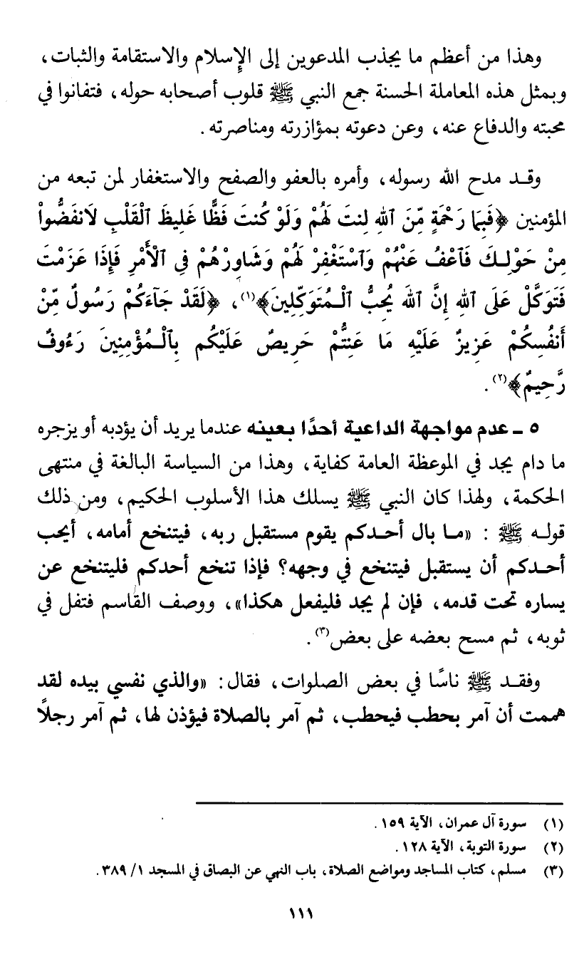 وقد مدح الله رسوله، وأمره بالعفو والصفح والاستغفار لمن تبعه من المؤمنين {فَبِمَا رَحْمَةٍ مِنَ اللَّهِ لِنْتَ لَهُمْ وَلَوْ كُنْتَ فَظًّا غَلِيظَ الْقَلْبِ لَانْفَضُّوا مِنْ حَوْلِكَ فَاعْفُ عَنْهُمْ وَاسْتَغْفِرْ لَهُمْ وَشَاوِرْهُمْ فِي الْأَمْرِ فَإِذَا عَزَمْتَ فَتَوَكَّلْ عَلَى اللَّهِ إِنَّ اللَّهَ يُحِبُّ الْمُتَوَكِّلِينَ} [آل عمران: 159] (¬1) {لَقَدْ جَاءَكُمْ رَسُولٌ مِنْ أَنْفُسِكُمْ عَزِيزٌ عَلَيْهِ مَا عَنِتُّمْ حَرِيصٌ عَلَيْكُمْ بِالْمُؤْمِنِينَ رَءُوفٌ رَحِيمٌ} [التوبة: 128] (¬2) 5 - عدم مواجهة الداعية أحدًا بعينه عندما يريد أن يؤدبه أو يزجره ما دام يجد في الموعظة العامة كفاية، وهذا من السياسة البالغة في منتهى الحكمة، ولهذا كان النبي صلى الله عليه وسلم يسلك هذا الأسلوب الحكيم، ومن ذلك قوله صلى الله عليه وسلم: «ما بال أحدكم يقوم مستقبل ربه، فيتنخع أمامه، أيحب أحدكم أن يستقبل فيتنخع في وجهه؟ فإذا تنخع أحدكم فليتنخع عن يساره تحت قدمه، فإن لم يجد فليفعل هكذا»، ووصف القاسم فتفل في ثوبه، ثم مسح بعضه على بعض (¬3).