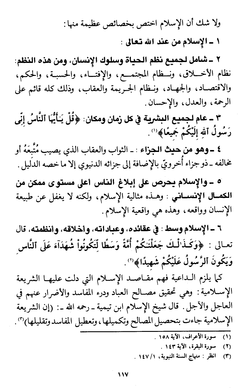 6 - الإسلام وسط: في عقائده، وعباداته، وأخلاقه، وأنظمته، قال تعالى: {وَكَذَلِكَ جَعَلْنَاكُمْ أُمَّةً وَسَطًا لِتَكُونُوا شُهَدَاءَ عَلَى النَّاسِ وَيَكُونَ الرَّسُولُ عَلَيْكُمْ شَهِيدًا} [البقرة: 143] (¬2).