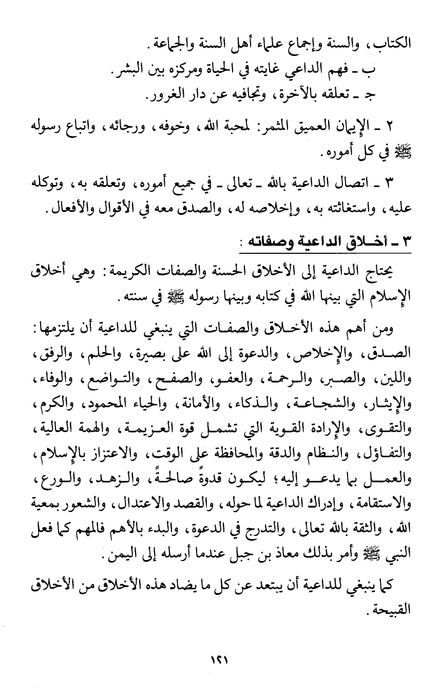 3 - أخلاق الداعية وصفاته: يحتاج الداعية إلى الأخلاق الحسنة والصفات الكريمة: وهي أخلاق الإسلام التي بينها الله في كتابه وبينها رسوله صلى الله عليه وسلم في سنته.