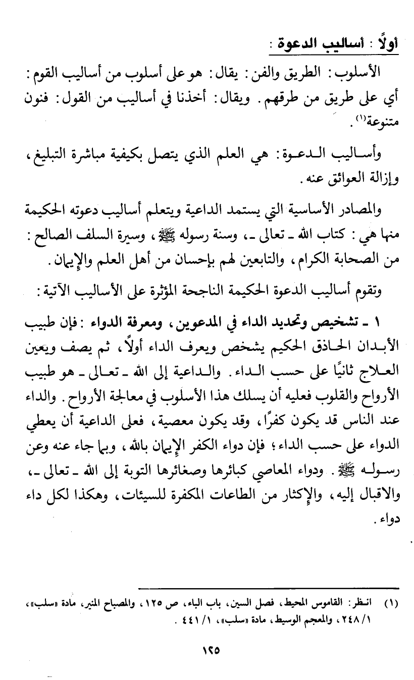 1 - تشخيص وتحديد الداء في المدعوين، ومعرفة الدواء: فإن طبيب الأبدان الحاذق الحكيم يشخص ويعرف الداء أولًا، ثم يصف ويعين العلاج ثانيًا على حسب الداء. والداعية إلى الله- تعالى- هو طبيب الأرواح والقلوب فعليه أن يسلك هذا الأسلوب في معالجة الأرواح. والداء عند الناس قد يكون كفرًا، وقد يكون معصية، فعلى الداعية أن يعطي الدواء على حسب الداء؛ فإن دواء الكفر الإيمان بالله، وبما جاء عنه وعن رسوله صلى الله عليه وسلم. ودواء المعاصي كبائرها وصغائرها التوبة إلى الله- تعالى-، والإقبال إليه، والإكثار من الطاعات المكفرة للسيئات، وهكذا لكل داء دواء.