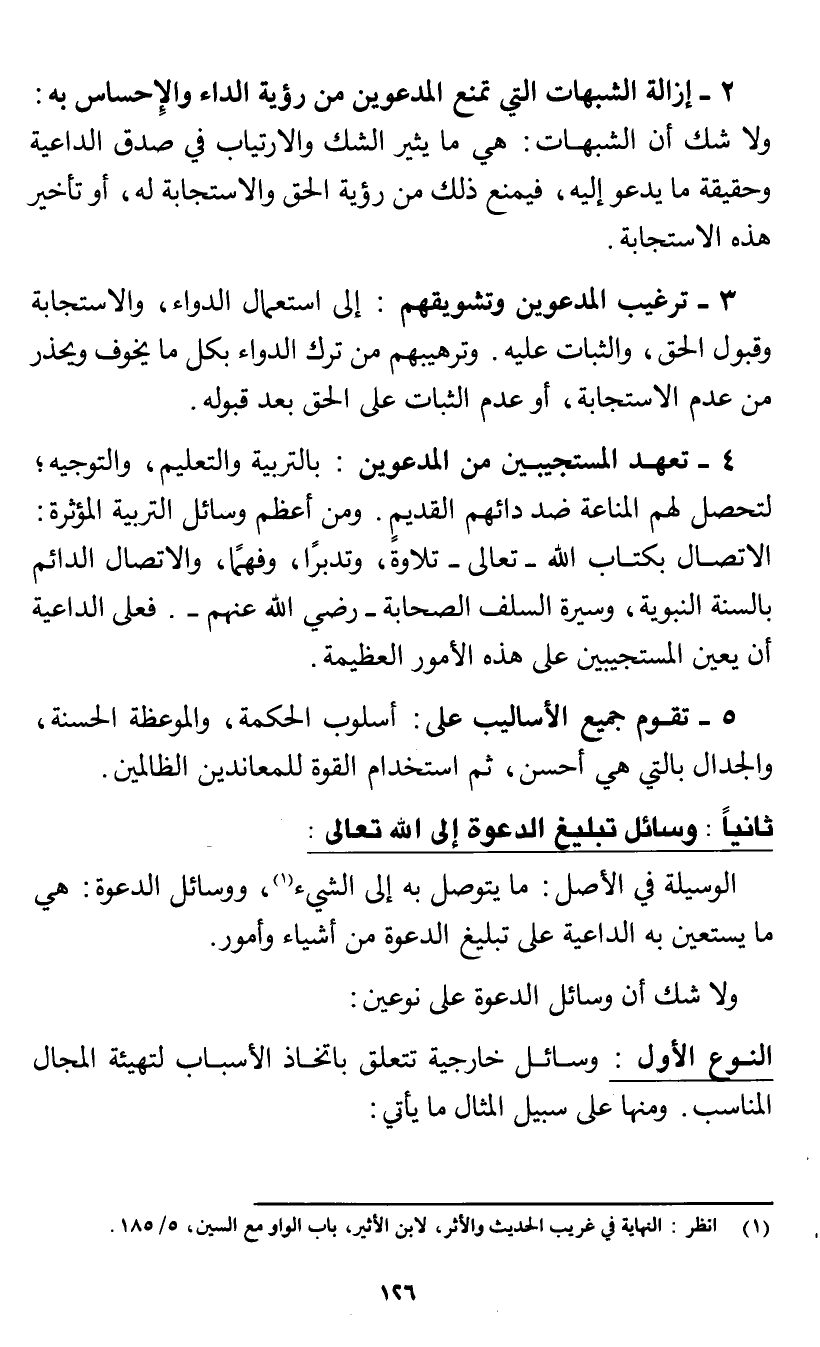 4 - تعهد المستجيبين من المدعوين: بالتربية والتعليم، والتوجيه؛ لتحصل لهم المناعة ضد دائهم القديم. ومن أعظم وسائل التربية المؤثرة: الاتصال بكتاب الله- تعالى- تلاوة، وتدبرًا، وفهمًا، والاتصال الدائم بالسنة النبوية، وسيرة السلف الصحابة- رضي الله عنهم-. فعلى الداعية أن يعين المستجيبين على هذه الأمور العظيمة.