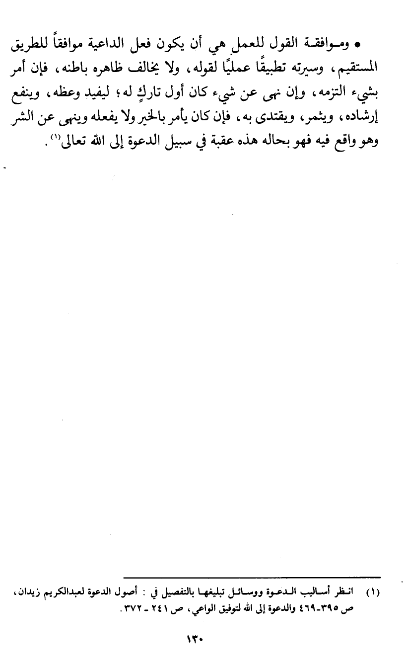 وموافقة القول للعمل هي أن يكون فعل الداعية موافقاً للطريق المستقيم، وسيرته تطبيقًا عمليًا لقوله، ولا يخالف ظاهره باطنه، فإن أمر بشيء التزمه، وإن نهى عن شيء كان أول تاركٍ له؛ ليفيد وعظه، وينفع إرشاده، ويثمر، ويقتدي به، فإن كان يأمر بالخير ولا يفعله وينهى عن الشر وهو واقع فيه فهو بحاله هذه عقبة في سبيل الدعوة إلى الله تعالى (¬1)