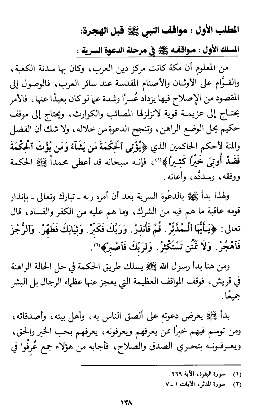 ولهذا بدأ صلى الله عليه وسلم بالدعوة السرية بعد أن أمره ربه- تبارك وتعالى- بإنذار قومه عاقبة ما هم فيه من الشرك، وما هم عليه من الكفر والفساد، قال تعالى: {يَا أَيُّهَا الْمُدَّثِّرُ - قُمْ فَأَنْذِرْ - وَرَبَّكَ فَكَبِّرْ - وَثِيَابَكَ فَطَهِّرْ - وَالرُّجْزَ فَاهْجُرْ - وَلَا تَمْنُنْ تَسْتَكْثِرُ - وَلِرَبِّكَ فَاصْبِرْ} [المدثر: 1 - 7] (¬2).