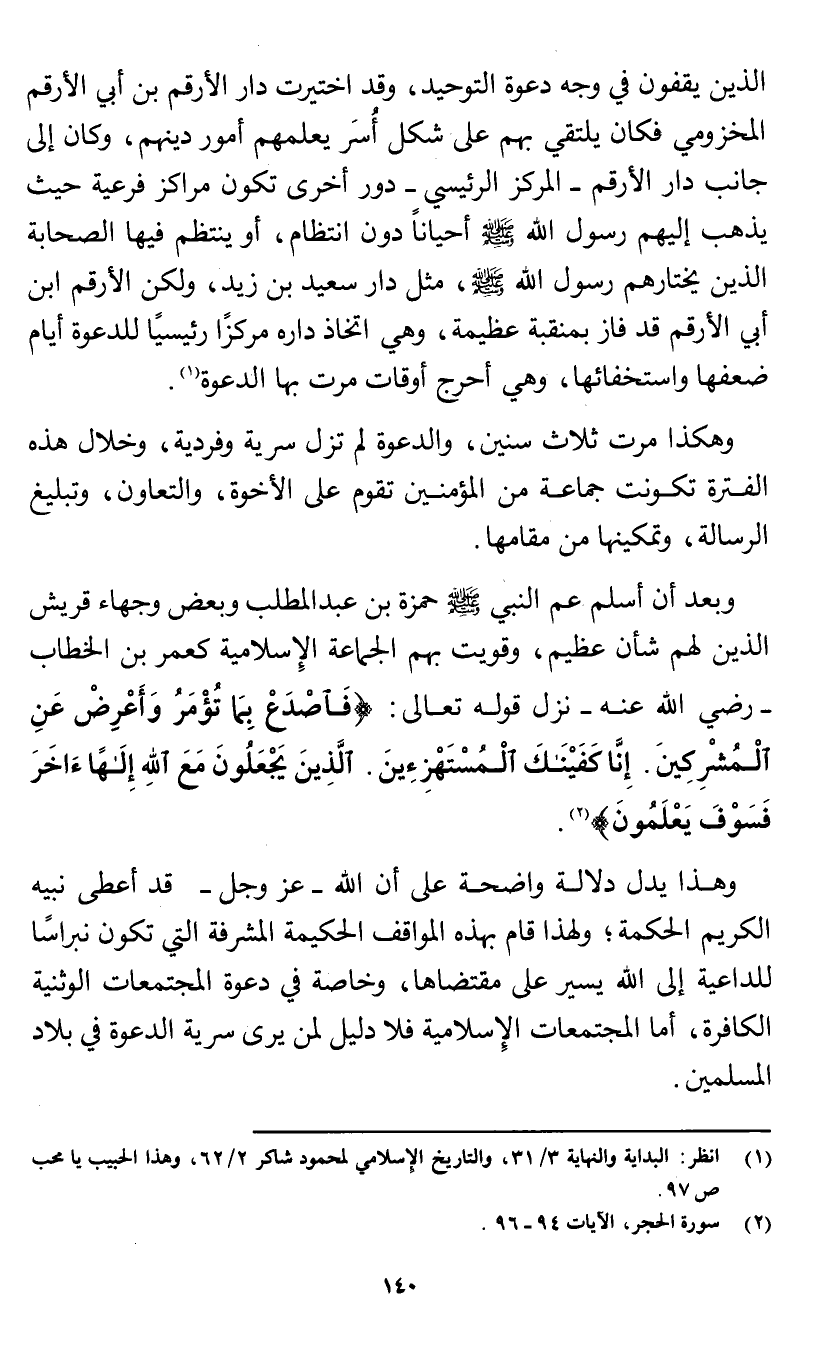 الذين يقفون في وجه دعوة التوحيد، وقد اختيرت دار الأرقم بن أبي الأرقم المخزومي فكان يلتقي بهم على شكل أُسَر يعلمهم أمور دينهم، وكان إلى جانب دار الأرقم - المركز الرئيسي- دور أخرى تكون مراكز فرعية حيث يذهب إليهم رسول الله صلى الله عليه وسلم أحيانًا دون انتظام، أو ينتظم فيها الصحابة الذين يختارهم رسول الله صلى الله عليه وسلم، مثل دار سعيد بن زيد، ولكن الأرقم بن أبي الأرقم قد فاز بمنقبة عظيمة، وهي اتخاذ داره مركزًا رئيسيًا للدعوة أيام ضعفها واستخفائها، وهي أحرج أوقات مرت بها الدعوة (¬1).