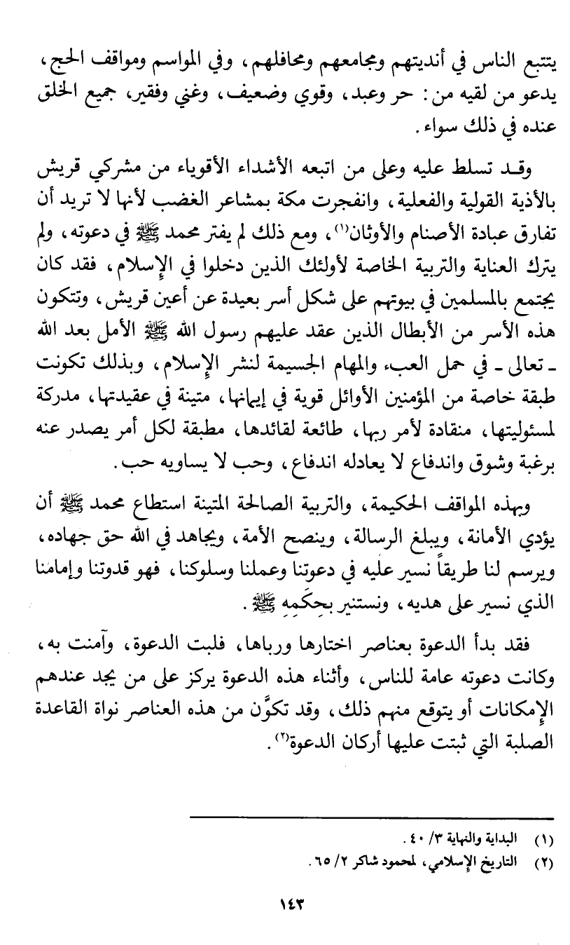 فقد بدأ الدعوة بعناصر اختارها ورباها، فلبت الدعوة، وآمنت به، وكانت دعوته عامة للناس، وأثناء هذه الدعوة يركز على من يجد عندهم الإمكانات أو يتوقع منهم ذلك، وقد تكون من هذه العناصر نواة القاعدة الصلبة التي ثبتت عليها أركان الدعوة (¬2).