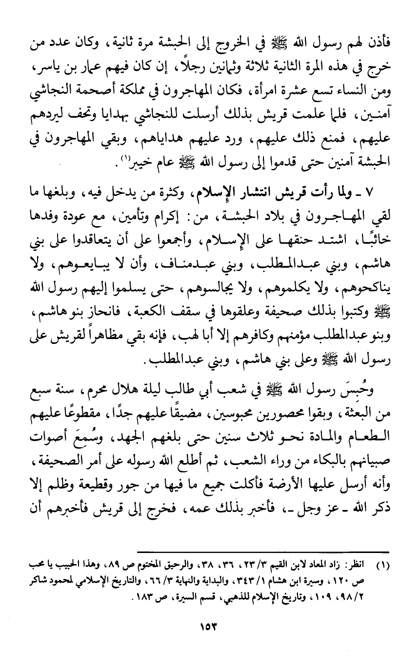 7 - ولما رأت قريش انتشار الإسلام، وكثرة من يدخل فيه، وبلغها ما لقي المهاجرون في بلاد الحبشة، من: إكرام وتأمين، مع عودة وفدها خائبًا، اشتد حنقها على الإسلام، وأجمعوا على أن يتعاقدوا على بني هاشم، وبني عبد المطلب، وبني عبد مناف وأن لا يبايعوهم، ولا يناكحوهم، ولا يكلموهم، ولا يجالسوهم، حتى يسلموا إليهم رسول الله صلى الله عليه وسلم وكتبوا بذلك صحيفة وعلقوها في سقف الكعبة، فانحاز بنو هاشم، وبنو عبد المطلب مؤمنهم وكافرهم إلا أبا لهب، فإنه بقي مظاهرًا لقريش على رسول الله صلى الله عليه وسلم وعلى بني هاشم، وبني عبد المطلب.