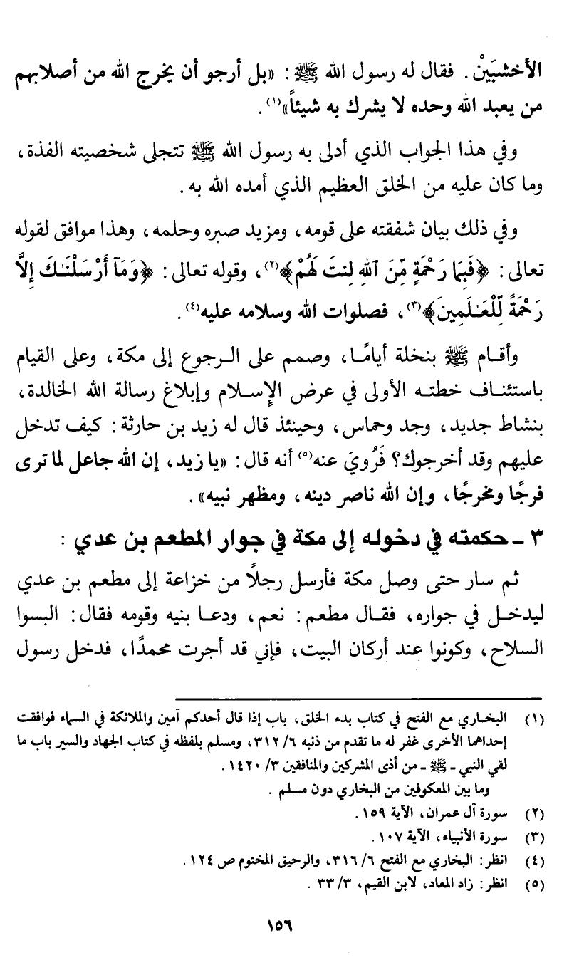 3 - حكمته في دخوله إلى مكة في جوار المطعم بن عدي: ثم سار حتى وصل مكة فأرسل رجلًا من خزاعة إلى مطعم بن عدي ليدخل في جواره، فقال مطعم: نعم، ودعا بنيه وقومه فقال: البسوا السلاح، وكونوا عند أركان البيت، فإني قد أجرت محمدًا، فدخل رسول