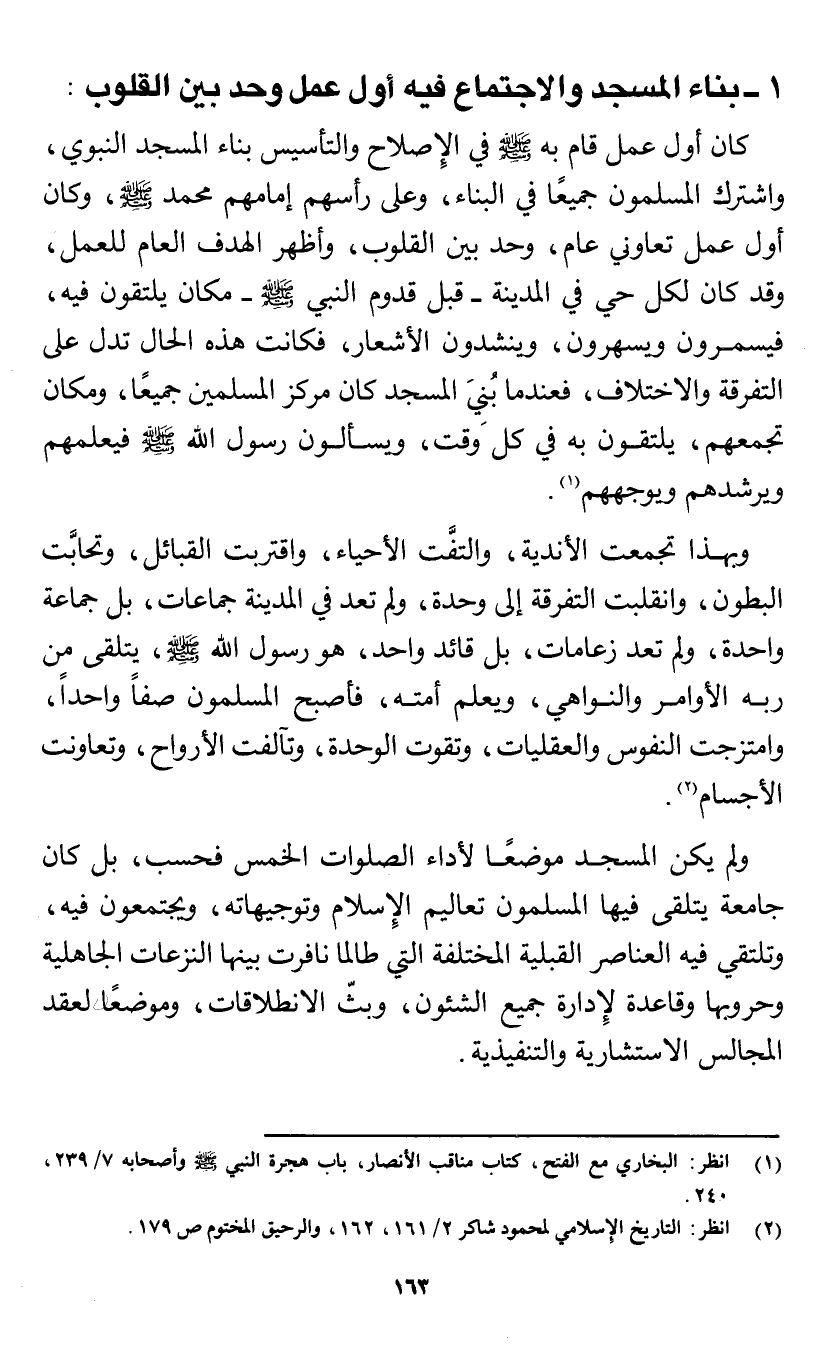1 - بناء المسجد والاجتماع فيه أولى عمل وحد بين القلوب: كان أول عمل قام به صلى الله عليه وسلم في الإصلاح والتأسيس بناء المسجد النبوي، واشترك المسلمون جميعًا في البناء، وعلى رأسهم إمامهم محمد صلى الله عليه وسلم، وكان أول عمل تعاوني عام، وحد بين القلوب، وأظهر الهدف العام للعمل، وقد كان لكل حي في المدينة - قبل قدوم النبي صلى الله عليه وسلم مكان يلتقون فيه، فيسمرون ويسهرون، وينشدون الأشعار، فكانت هذه الحال تدل على التفرقة والاختلاف، فعندما بُنيَ المسجد كان مركز المسلمين جميعًا، ومكان تجمعهم، يلتقون به في كل وقت، ويسألون رسول الله صلى الله عليه وسلم فيعلمهم ويرشدهم ويوجههم (¬1).