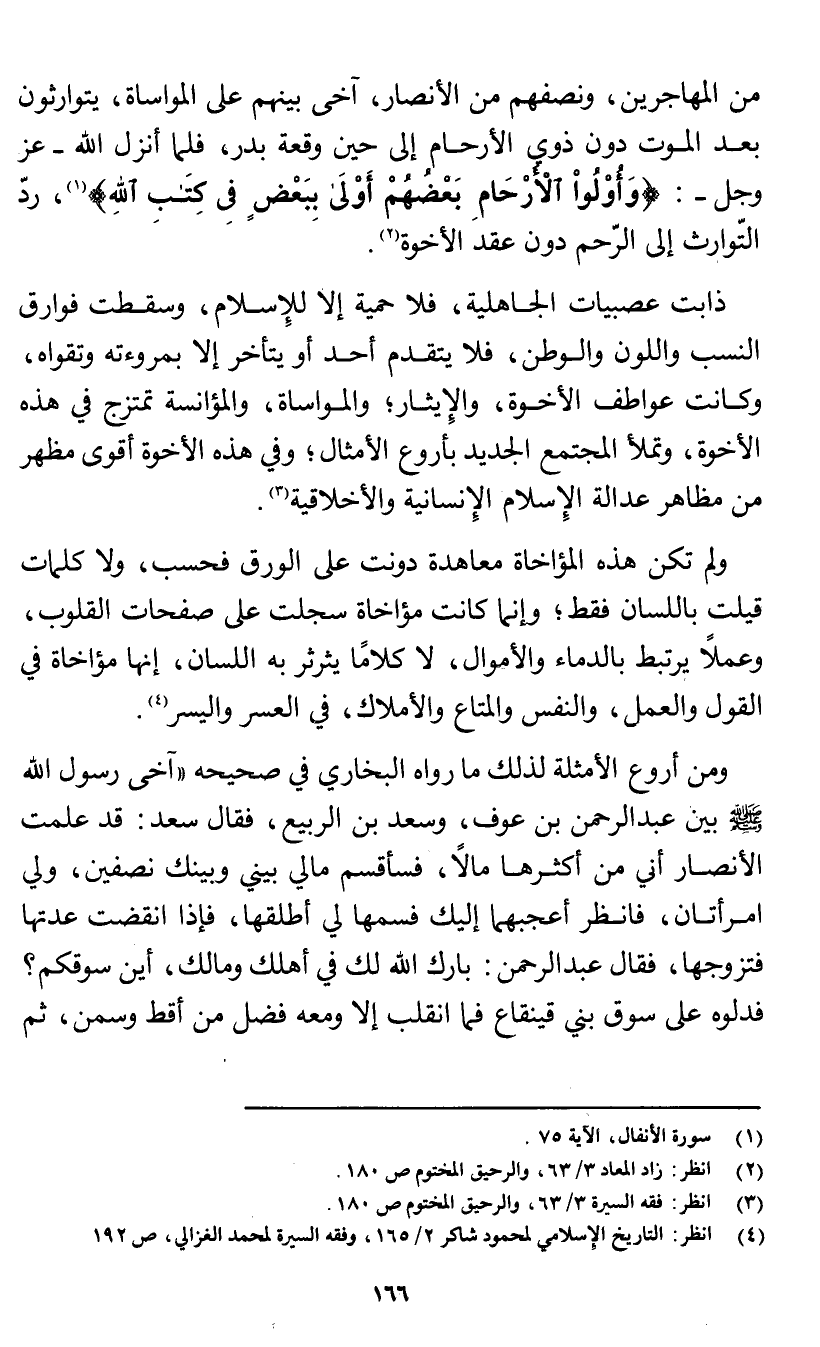 ولم تكن هذه المؤاخاة معاهدة دونت على الورق فحسب، ولا كلمات قيلت باللسان فقط؛ وإنما كانت مؤاخاة سجلت على صفحات القلوب، وعملا يرتبط بالدماء والأموال، لا كلامًا يثرثر به اللسان، إنها مؤاخاة في القول والعمل، والنفس والمتاع والأملاك، في العسر واليسر (¬4).