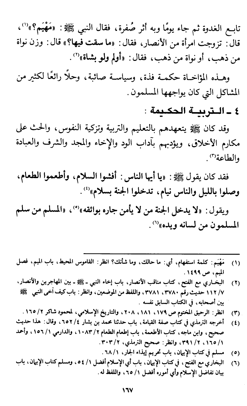 4 - التربية الحكيمة: وقد كان صلى الله عليه وسلم يتعهدهم بالتعليم والتربية وتزكية النفوس، والحث على مكارم الأخلاق، ويؤدبهم بآداب الود والإخاء والمجد والشرف والعبادة والطاعة (¬3) فقد كان يقول صلى الله عليه وسلم: «يا أيها الناس: أفشوا السلام، وأطعموا الطعام، وصلوا بالليل والناس نيام، تدخلوا الجنة بسلام» (¬4) ويقول: «لا يدخل الجنة من لا يأمن جاره بوائقه» (¬5) «المسلم من سلم المسلمون من لسانه ويده» (¬6).