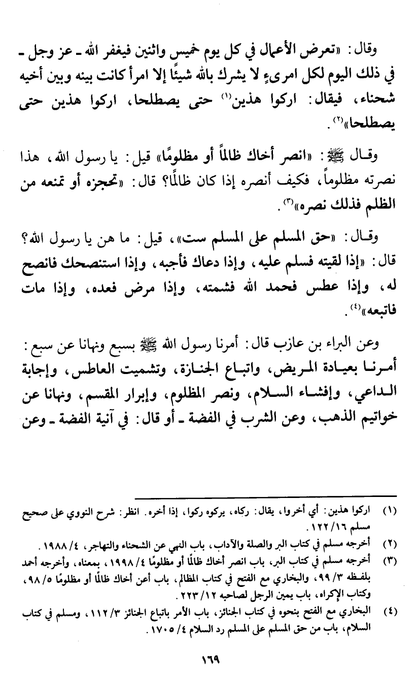 وقال: «تعرض الأعمال في كل يوم خميسِ واثنين فيغفر الله- عز وجل- في ذلك اليوم لكل امرئٍ لا يشرك بالله شيئا إلا امرأ كانت بينه وبين أخيه شحناء، فيقال: اركوا هذين (¬1) حتى يصطلحا، اركوا هذين حتى يصطلحا» (¬2) وقال صلى الله عليه وسلم: «انصر أخاك ظالما أو مظلومًا" قيل: يا رسول الله، هذا نصرته مظلوما، فكيف أنصره إذا كان ظالمًا؟ قال: "تحجزه أو تمنعه من الظلم فذلك نصره» (¬3) وقال: «حق المسلم على المسلم ست "، قيل: ما هن يا رسول الله؟ قال: "إذا لقيته فسلم عليه، وإذا دعاك فأجبه، وإذا استنصحك فانصح له، وإذا عطس فحمد الله فشمته، وإذا مرض فعده، وإذا مات فاتبعه» (¬4) وعن البراء بن عازب قال: «أمرنا رسول الله صلى الله عليه وسلم بسبع ونهانا عن سبع: أمرنا بعيادة المريض، واتباع الجنازة، وتشميت العاطس، وإجابة الداعي، وإفشاء السلام، ونصر المظلوم، وإبرار المقسم، ونهانا عن خواتيم الذهب، وعن الشرب في الفضة- أو قال: في آنية الفضة- وعن