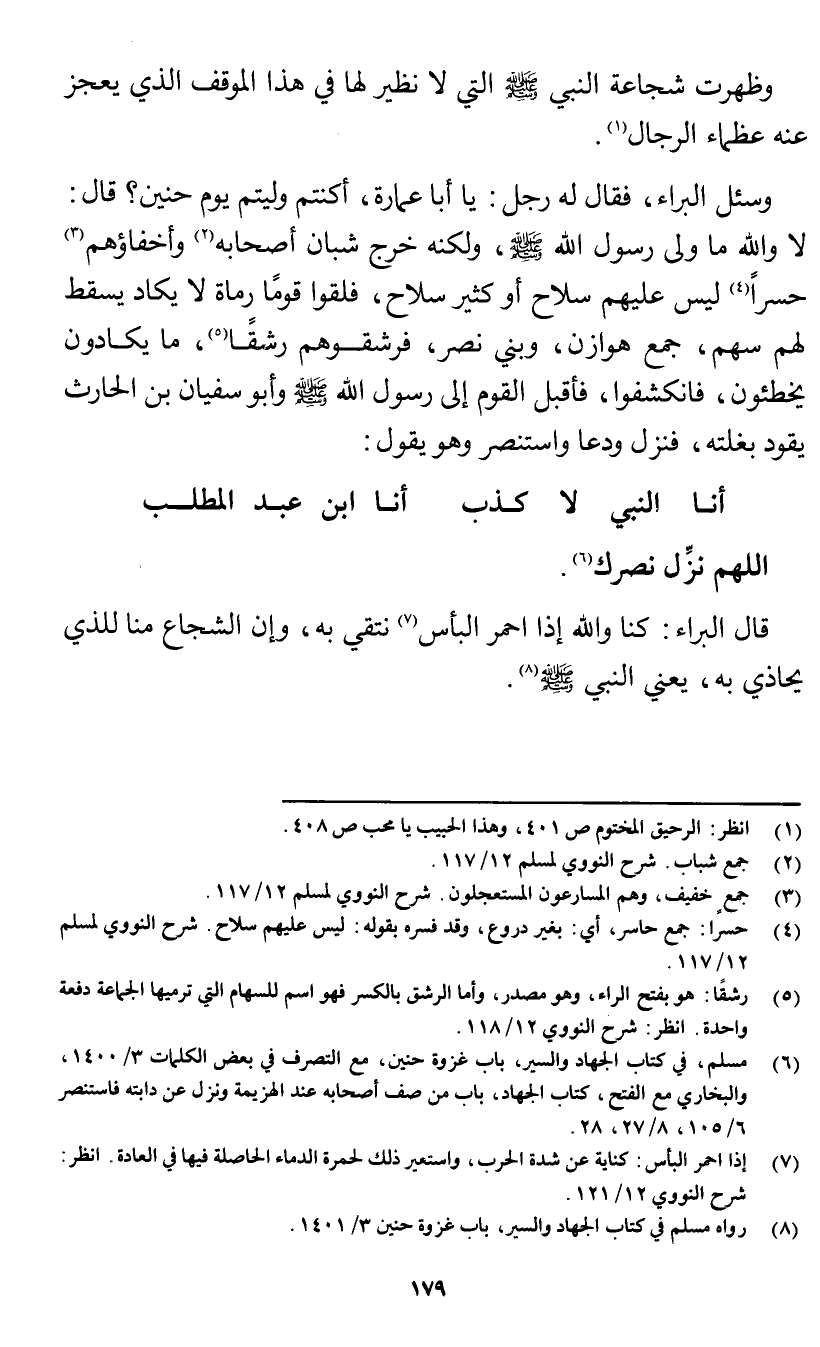 (¬5) مسلم، في كتاب الجهاد والسير، باب غزوة حنين، مع التصرف في بعض الكلمات3/ 1400، والبخاري مع الفتح، كتاب الجهاد، باب من صف أصحابه عند الهزيمة ونزل عن دابته فاستنصر 6/ 105، 8/ 27، 28.