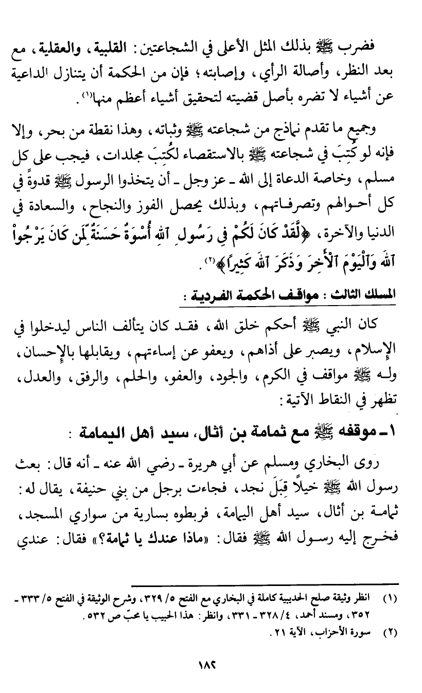 فضرب صلى الله عليه وسلم بذلك المثل الأعلى في الشجاعتين: القلبية، والعقلية، مع بعد النظر، وأصالة الرأي، وإصابته؛ فإن من الحكمة أن يتنازل الداعية عن أشياء لا تضره بأصل قضيته لتحقيق أشياء أعظم منها (¬1).