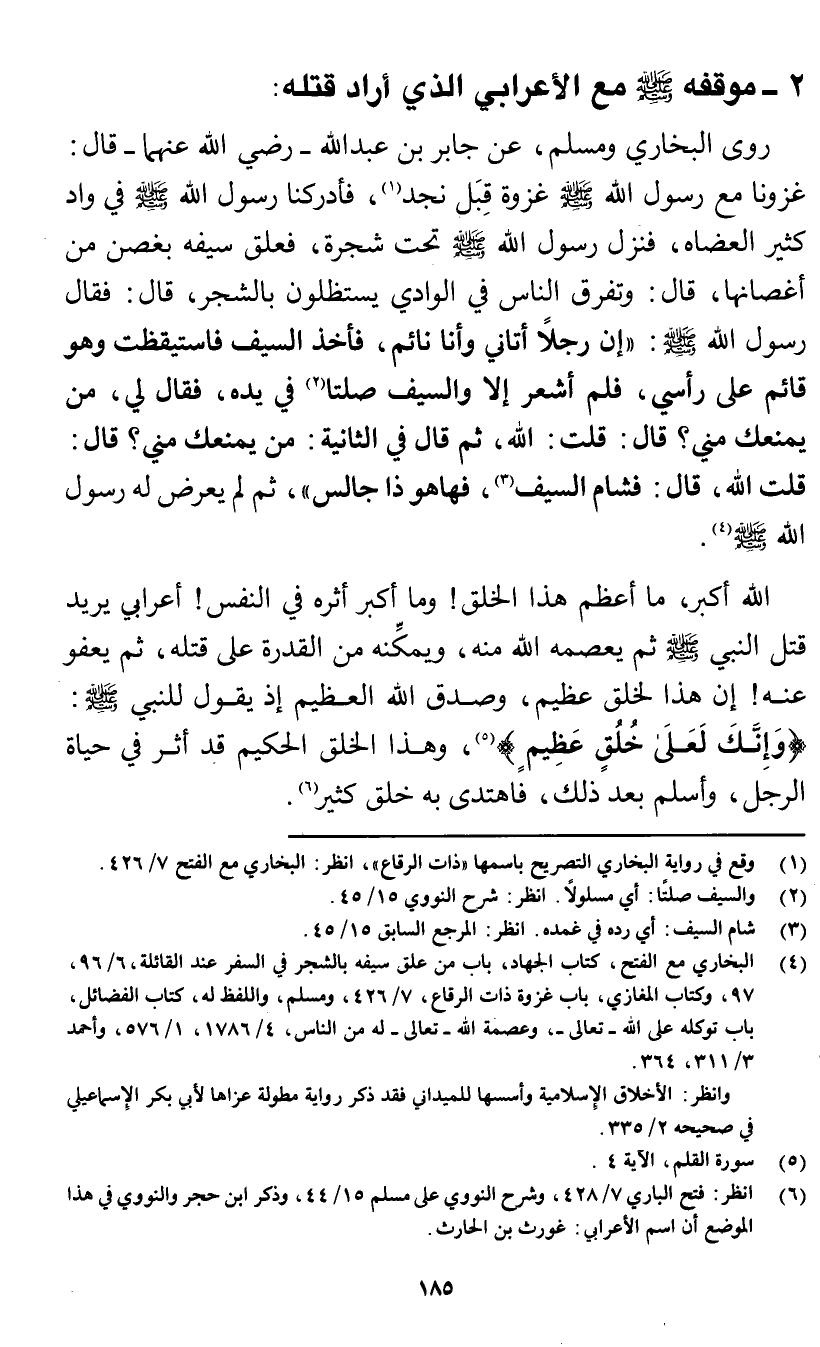 (¬4) البخاري مع الفتح، كتاب الجهاد، باب من علق سيفه بالشجر في السفر عند القائلة، 6/ 96، 97، وكتاب المغازي، باب غزوة ذات الرقاع، 7/ 426، ومسلم، واللفظ له، كتاب الفضائل، باب توكله على الله- تعالى-، وعصمة الله- تعالى- له من الناس، 4/ 1786، 1/ 576، وأحمد 3/ 311، 364. وانظر: الأخلاق الإسلامية وأسسي للميداني فقد ذكر رواية مطولة عزاها لأب بكر الإسماعيلي في صحيحه 2/ 335.
