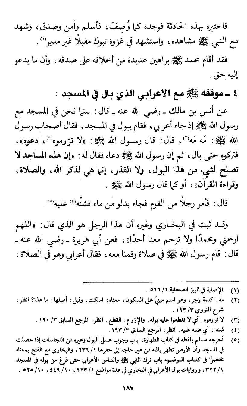 (¬5) أخرجه مسلم بلفظه في كتاب الطهارة، باب وجوب غسل البول وغيره من النجاسات إذا حصلت في المسجد وأن الأرض تطهر بالماء من غير حاجة إلى حفرها 1/ 236، والبخاري مع الفتح بمعناه مختصرا في كتاب الوضوء باب ترك النبي صلى الله عليه وسلم والناس الأعراب حتى فرغ من بوله في المسجد 1/ 322، وروايات بول الأعرابي في البخاري في عدة مواضع1/ 223، 10/ 449، 10/ 525.