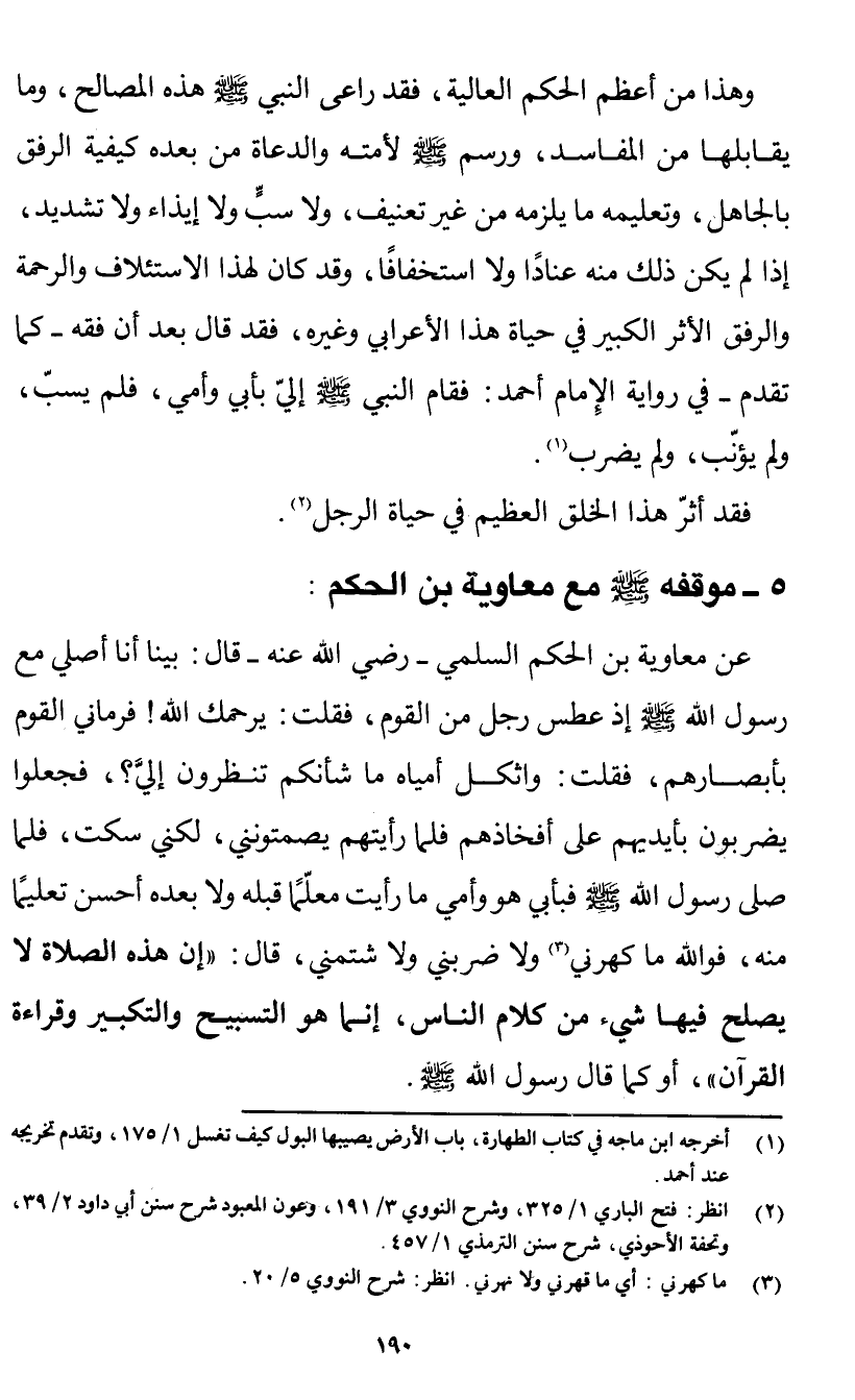 وهذا من أعظم الحكم العالية، فقد راعى النبي صلى الله عليه وسلم هذه المصالح، وما يقابلها من المفاسد، ورسم صلى الله عليه وسلم لأمته والدعاة من بعده كيفية الرفق بالجاهل، وتعليمه ما. يلزمه من غير تعنيف، ولا سبٍّ ولا إيذاء ولا تشديد، إذا لم يكن ذلك منه عنادًا ولا استخفافًا، وقد كان لهذا الاستئلاف والرحمة والرفق الأثر الكبير في حياة هذا الأعرابي وغيره، فقد قال بعد أن فقه- كما تقدم- في رواية الإمام أحمد: فقام النبي صلى الله عليه وسلم إليّ بأبي وأمي، فلم يسبّ، ولم يؤنّب، ولم يضرب (¬1) قد أثر هذا الخلق العظيم في حياة الرجل (¬2) 5 - موقفه صلى الله عليه وسلم مع معاوية بن الحكم: عن معاوية بن الحكم السلمي - رضي الله عنه- قال: «بينا أنا أصلي مع رسول الله صلى الله عليه وسلم إذ عطس رجل من القوم، فقلت: يرحمك الله! فرماني القوم بأبصارهم، فقلت: واثكل أمياه ما شأنكم تنظرون إليّ؟، فجعلوا يضربون بأيديهم على أفخاذهم فلما رأيتهم يصمتونني، لكني سكت، فلما صلى رسول الله صلى الله عليه وسلم فبأبي هو وأمي ما رأيت معلما قبله ولا بعده أحسن تعليمًا منه، فوالله ما كهرني (¬3) ولا ضربني ولا شتمني، قال: "إن هذه الصلاة لا يصلح فيها شيء من كلام الناس، إنما هو التسبيح والتكبير وقراءة القران "، أو كما قال رسول الله صلى الله عليه وسلم.