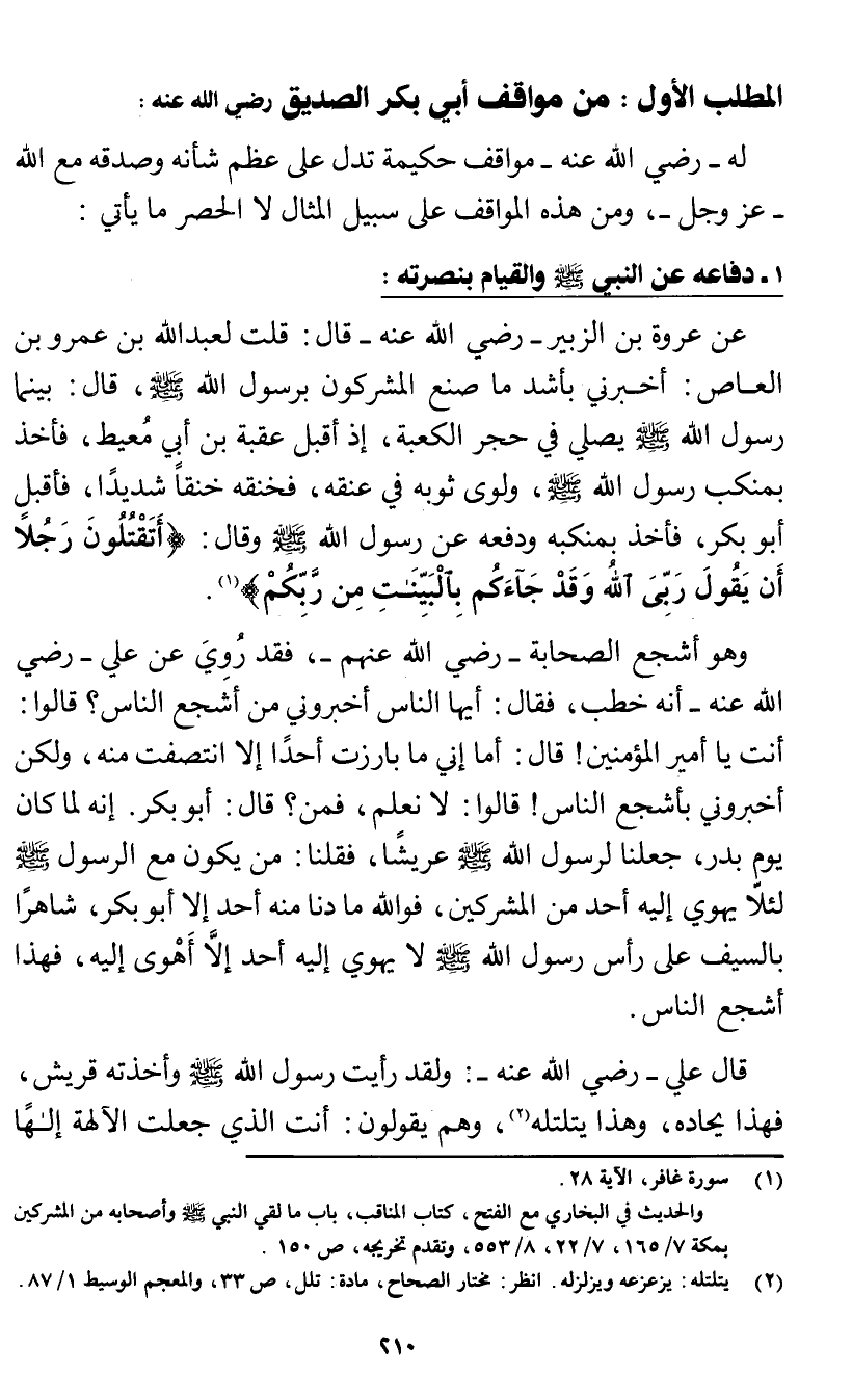 عن عروة بن الزبير - رضي الله عنه - قال: قلت لعبد الله بن عمرو بن العاص: أخبرني بأشد ما صنع المشركون برسول الله صلى الله عليه وسلم، قال: بينما رسول الله صلى الله عليه وسلم يصلي في حجر الكعبة، إذ أقبل عقبة بن أبي مُعيط، فأخذ بمنكب رسول الله صلى الله عليه وسلم، ولوى ثوبه في عنقه، فخنقه خنقًا شديدًا، فأقبلِ أبو بكر، فأخذ بمنكبه ودفعه عن رسول الله صلى الله عليه وسلم وقال: {أَتَقْتُلُونَ رَجُلًا أَنْ يَقُولَ رَبِّيَ اللَّهُ وَقَدْ جَاءَكُمْ بِالْبَيِّنَاتِ مِنْ رَبِّكُمْ} [غافر: 28] (¬1).