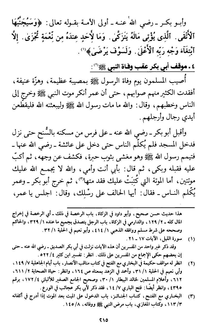 (¬1) سورة الليل، الآيات 17 - 21. وقد ذكر غير واحد من المفسرين أن هذه الآيات نزلت في أبي بكر الصديق - رصي الله عنه - إن بعضهم حكى الإِجماع من المفسرين على ذلك انظر: تفسير ابن كثير 4/ 522.
