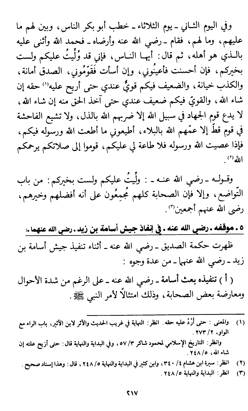 (أ) تنفيذه بعث أسامة - رضي الله عنه - على الرغم من شدة الأحوال ومعارضة بعض الصحابة، وذلك امتثالًا لأمر النبي صلى الله عليه وسلم.