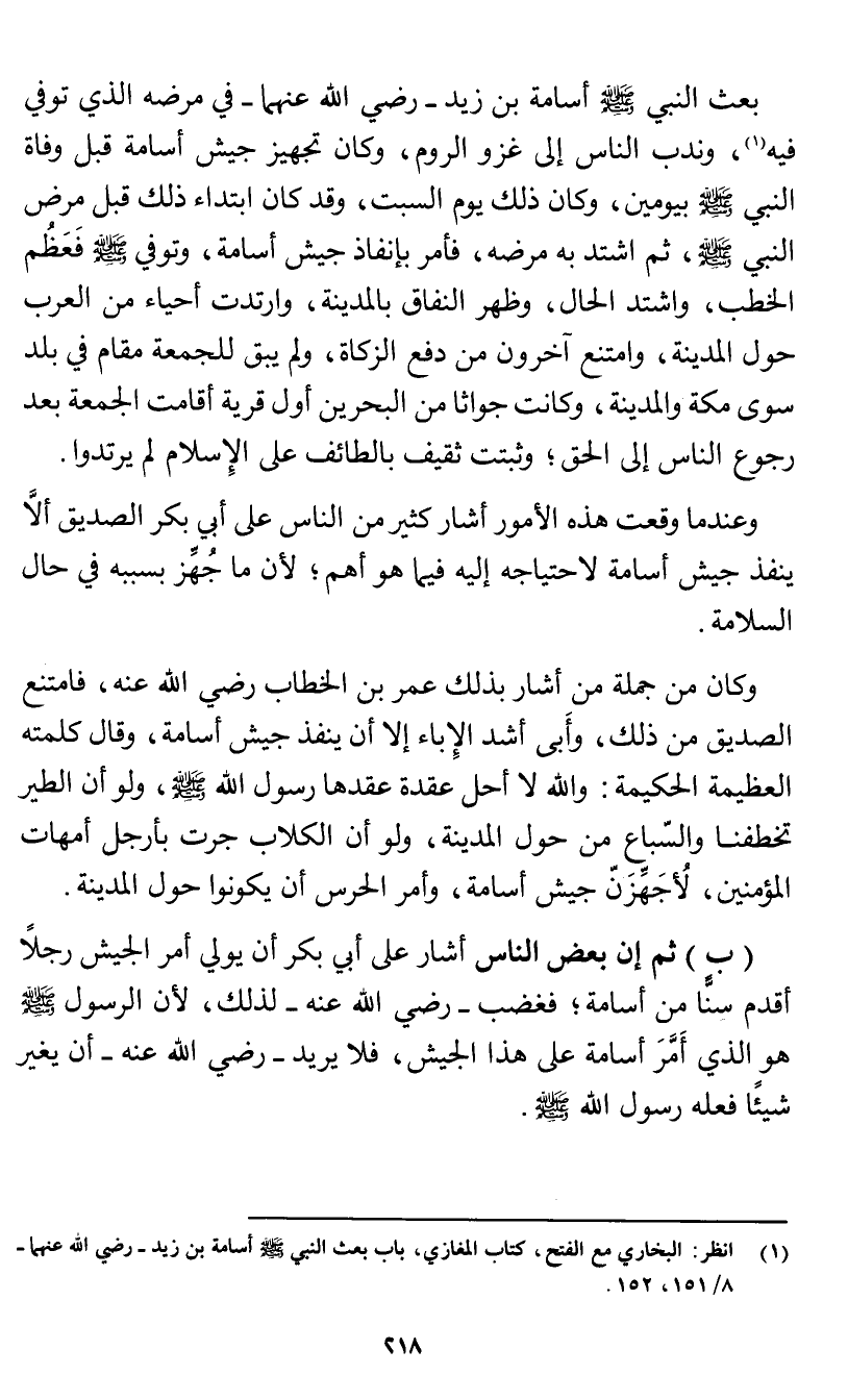(¬1) انظر: البخاري مع الفتح، كتاب المغازي، باب بعث النبي صلى الله عليه وسلم أسامة بن زيد - رضي الله عنهما -8/ 151 - 152.
