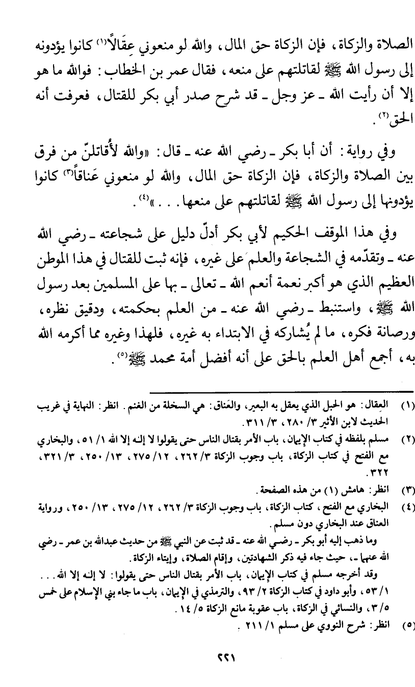(¬2) مسلم بلفظه في كتاب الإيمان، باب الأمر بقتال الناس حتى يقولوا لا إله إلا الله 1/ 51، والبخاري مع الفتح في كتاب الزكاة، باب وجوب الزكاة 3/ 262، 12/ 275، 13/ 250، 3/ 321، 322.