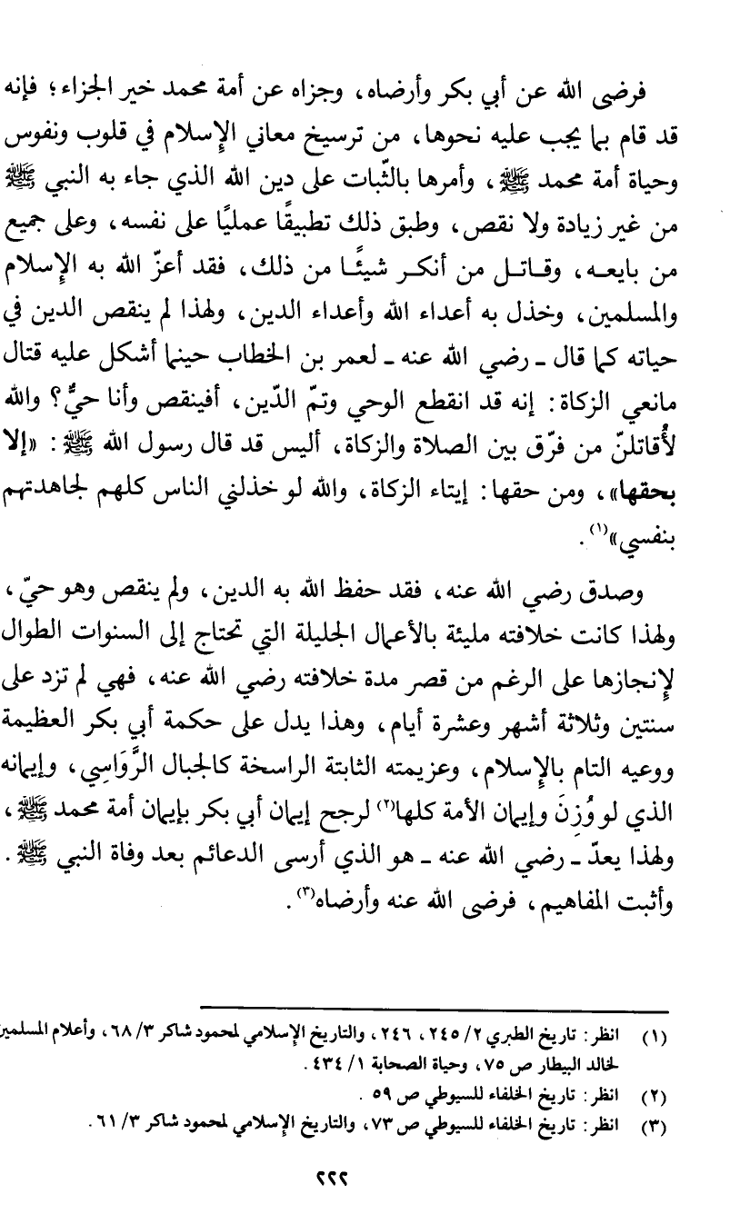 فرضي الله عن أبي بكر وأرضاه، وجزاه عن أمة محمد خير الجزاء؛ فإنه قد قام بما يجب عليه نحوها، من ترسيخ معاني الإِسلام في قلوب ونفوس وحياة أمة محمد صلى الله عليه وسلم، وأمرها بالثّبات على دين الله الذي جاء به النبي صلى الله عليه وسلم من غير زيادة ولا نقص، وطبق ذلك تطبيقًا عمليًا على نفسه، وعلى جميع من بايعه، وقاتل من أنكر شيئًا من ذلك، فقد أعزّ الله به الإِسلام والمسلمين، وخذل به أعداء الله وأعداء الدين، ولهذا لم ينقص الدين في حياته كما قال - رضي الله عنه - لعمر بن الخطاب حينما أشكل عليه قتال مانعي الزكاة: إنه قد انقطع الوحي وتمّ الدّين، أفينقص وأنا حي؟ والله لأقاتلنّ من فرّق بين الصلاة والزكاة، أليس قد قال رسول الله صلى الله عليه وسلم: " إلا بحقها "، ومن حقها: إيتاء الزكاة، والله لو خذلني الناس كلهم لجاهدتهم بنفسي " (¬1).