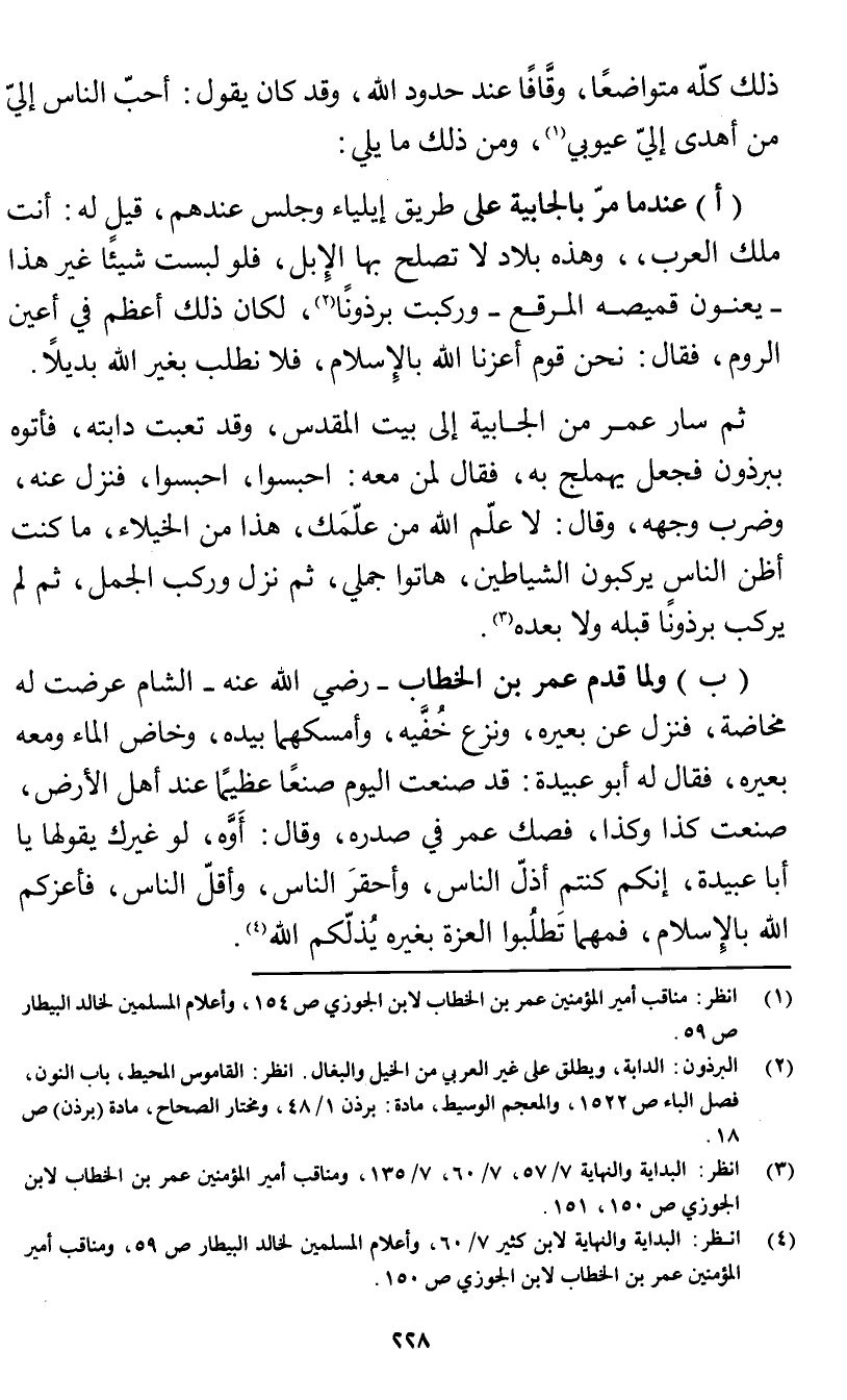 (ب) ولما قدم عمر بن الخطاب - رضي الله عنه - الشام عرضت له مخاضة، فنزل عن بعيره، ونزع خُفَّيه، وأمسكهما بيده، وخاض الماء ومعه بعيره، فقال له أبو عبيدة: قد صنعت اليوم صنعًا عظيمًا عند أهل الأرض، صنعت كذا وكذا، فصك عمر في صدره، وقال: أَؤَّه، لو غيرك يقولها يا أبا عبيدة، إنكم كنتم أذل الناس، وأحقر الناس، وأقل الناس، فأعزكم الله بالإِسلام، فمهما تَطلُبوا العزة بغيره يُذلّكم الله (¬4).