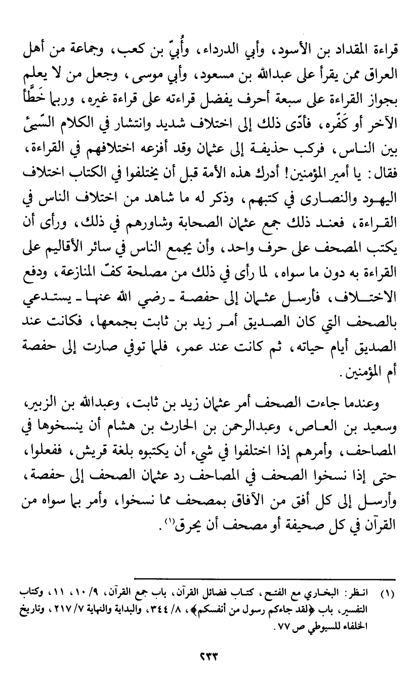 (¬1) انظر: البخاري مع الفتح، كتاب فضائل القرآن، باب جمع القرآن، 9/ 10، 11، وكتاب التفسير، باب لقد جاءكم رسول من أنفسكم، 8/ 344، والبداية والنهاية 7/ 217، وتاريخ الخلفاء للسيوطي ص 77.