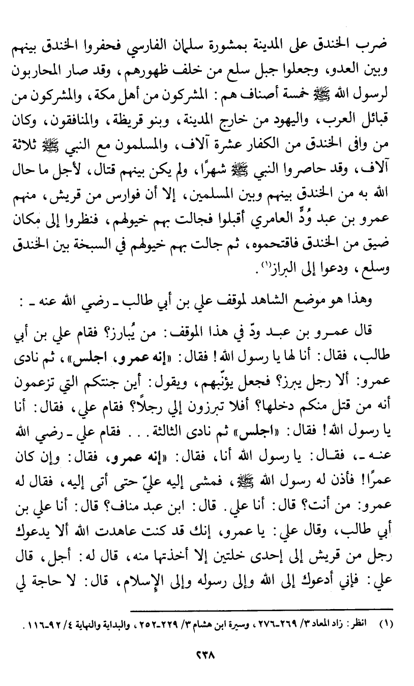 قال عمرو بن عبد ودّ في هذا الموقف: من يُبارز؟ فقام علي بن أبي طالب، فقال: أنا لها يا رسول الله! فقال: " إنه عمرو، اجلس "، ثم نادى عمرو: ألا رجل يبرز؟ فجعل يؤنّبهم، ويقول: أين جنتكم التي تزعمون أنه من قتل منكم دخلها؟ أفلا تبرزون إلي رجلًا؟ فقام علي، فقال: أنا يا رسول الله! فقال: " اجلس " ثم نادى الثالثة. . . فقام علي - رضي الله عنه -، فقال: يا رسول الله أنا، فقال: " إنه عمرو "، فقال: وإن كان عمرًا! فأذن له رسول الله صلى الله عليه وسلم، فمشى إليه علي حتى أتى إليه، فقال له عمرو: من أنت؟ قال: أنا علي. قال: ابن عبد مناف؟ قال: أنا علي بن أبي طالب، وقال علي: يا عمرو، إنك قد كنت عاهدت الله ألا يدعوك رجل من قريش إلى إحدى خلتين إلا أخذتها منه، قال له: أجل، قال علي: فإني أدعوك إلى الله وإلى رسوله وإلى الإِسلام، قال: لا حاجة لي