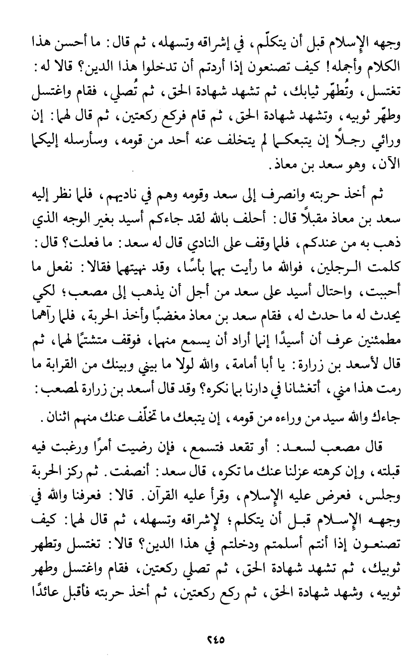قال مصعب لسعد: أو تقعد فتسمع، فإن رضيت أمرًا ورغبت فيه قبلته، وإن كرهته عزلنا عنك ما تكره، قال سعد: أنصفت. ثم ركز الحربة وجلس، فعرض عليه الإِسلام، وقرأ عليه القرآن. قالا: فعرفنا والله في وجهه الإِسلام قبل أن يتكلم؛ لإِشراقه وتَسهله، ثم قال لهما: كيف تصنعون إذا أنتم أسلمتم ودخلتم في هذا الدين؟ قالا: تغتسل وتطهر ثوبيك، ثم تشهد شهادة الحق، ثم تصلي ركعتين، فقام واغتسل وطهر ثوبيه، وشهد شهادة الحق، ثم ركع ركعتين، ثم أخذ حربته فأقبل عائدًا
