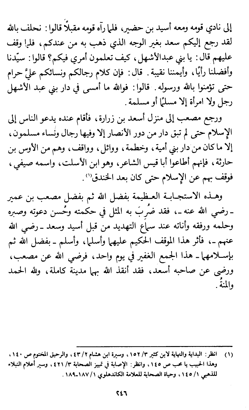 إلى نادي قومه ومعه أسيد بن حضير، فلما رآه قومه مقبلًا قالوا: نحلف بالله لقد رجع إليكم سعد بغير الوجه الذي ذهب به من عندكم، فلما وقف عليهم قال: يا بني عبد الأشهل، كيف تعلمون أمري فيكم؟ قالوا: سيّدنا وأفضلنا رأيًا، وأيمننا نقيبة. قال: فإن كلام رجالكم ونسائكم علي حرام حتى تؤمنوا بالله ورسوله. قالوا: فوالله ما أمسى في دار بني عبد الأشهل رجل ولا امرأة إلا مسلمًا أو مسلمة.