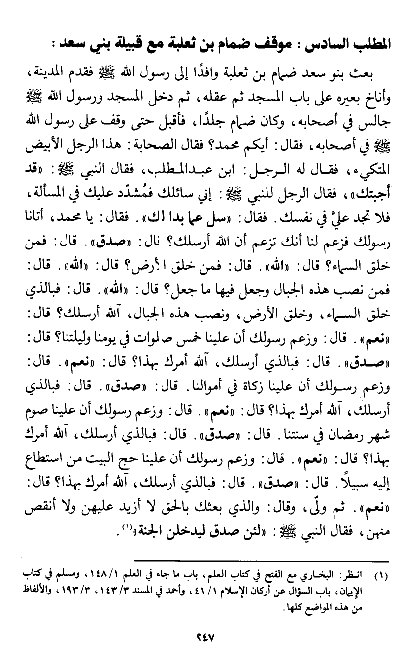بعث بنو سعد ضمام بن ثعلبة وافدًا إلى رسول الله صلى الله عليه وسلم فقدم المدينة، وأناخ بعيره على باب المسجد ثم عقله، ثم دخل المسجد ورسول الله صلى الله عليه وسلم جالس في أصحابه، وكان ضمام جلدًا، فأقبل حتى وقف على رسول الله صلى الله عليه وسلم في أصحابه، فقال: «أيكم محمد؟ فقال الصحابة: هذا الرجل الأبيض المتكئ، فقال له الرجل: ابن عبد المطلب، فقال النبي صلى الله عليه وسلم " قد أجبتك "، فقال الرجل للنبي صلى الله عليه وسلم: إني سائلك فمُشدّد عليك في المسألة، فلا تجد علي في نفسك. فقال: " سل عما بدا لك ". فقال: يا محمد، أتانا رسولك فزعم لنا أنك تزعم أن الله أرسلك؟ قال: " صدق ". قال: فمن خلق السماء؟ قال: " الله ". قال: فمن خلق الأرض؟ قال: " الله ". قال: فمن نصب هذه الجبال وجعل فيها ما جعل؟ قال: " الله ". قال: فبالذي خلق السماء، وخلق الأرض، ونصب هذه الجبال، آلله أرسلك؟ قال: " نعم ". قال: وزعم رسولك أن علينا خمس صلوات في يومنا وليلتنا؟ قال: " صدق ". قال: فبالذي أرسلك، آلله أمرك بهذا؟ قال: " نعم ". قال: وزعم رسولك أن علينا زكاة في أموالنا. قال: " صدق ". قال: فبالذي أرسلك، آلله أمرك بهذا؟ قال: " نعم ". قال: وزعم رسولك أن علينا صوم شهر رمضان في سنتنا. قال: " صدق ". قال: فبالذي أرسلك، آلله أمرك بهذا؟ قال: " نعم ". قال: وزعم رسولك أن علينا حج البيت من استطاع إليه سبيلًا. قال: " صدق ". قال: فبالذي أرسلك، آلله أمرك بهذا؟ قال: " نعم ". ثم ولّى، وقال: والذي بعثك بالحق لا أزيد عليهن ولا أنقص عنهن، فقال النبي صلى الله عليه وسلم: " لئن صدق ليدخلن الجنة» (¬1).