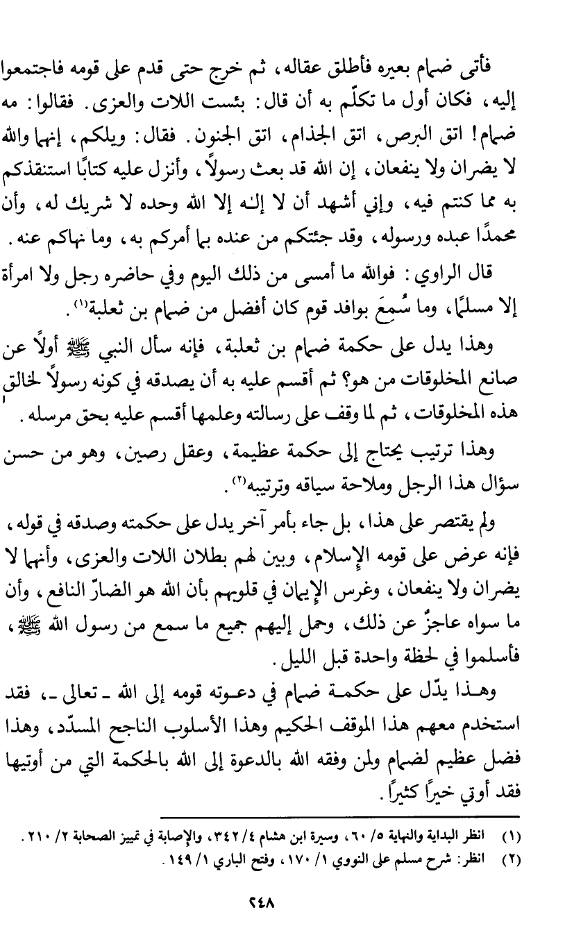 فأتى ضمام بعيره فأطلق عقاله، ثم خرج حتى قدم على قومه فاجتمعوا إليه، فكان أول ما تكلّم به أن قال: بئست اللات والعزى. فقالوا: مه ضمام! اتق البرص، اتق الجذام، اتق الجنون. فقال: ويلكم، إنهما والله لا يضران ولا ينفعان، إن الله قد بعث رسولًا، وأنزل عليه كتابًا استنقذكم به مما كنتم فيه، وإني أشهد أن لا إله إلا الله وحده لا شريك له، وأن محمدًا عبده ورسوله، وقد جئتكم من عنده بما أمركم به، وما نهاكم عنه. قال الراوي: فوالله ما أمسى من ذلك اليوم وفي حاضره رجل ولا امرأة إلا مسلمًا، وما سُمِعَ بوافد قوم كان أفضل من ضمام بن ثعلبة (¬1).