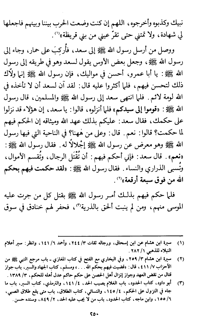 (¬2) سيرة ابن هشام 3/ 259، وفي البخاري مع الفتح في كتاب المغازي - باب مرجع النبي صلى الله عليه وسلم من الأحزاب 7/ 411، قال: " قضيت فيهم بحكم الله. . . " ومسلم، كتاب الجهاد والسير، باب جواز قتال من نقض العهد وجواز إنزال أهل الحصن على حكم حاكم عدل أهله للحكم، 3/ 1389.