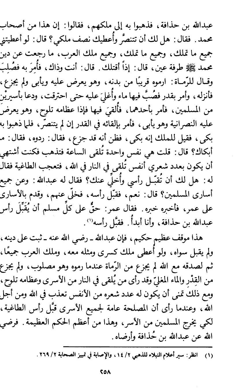 عبد الله بن حذافة، فذهبوا به إلى ملكهم، فقالوا: إن هذا من أصحاب محمد. فقال: هل لك أن تتنصَّر وأعطيك نصف ملكي؟ قال: لو أعطيتني جميع ما تملك، وجميع ما تملك، وجميع ملك العرب، ما رجعت عن دين محمد صلى الله عليه وسلم طرفة عين، قال: إذًا أقتلك. قال: أنت وذاك، فأُمِرَ به فصُلِبَ وقال للرّماة: ارموه قريبًا من بدنه، وهو يعرض عليه ويأبى ولم يجزع، فأنزله، وأمر بقدر فصُبَّ فيها ماء وأُغلي عليه حتى احترقت، ودعا بأسيريْنِ من المسلمين، فأمر بأحدهما، فأُلقي فيها فإذا عظامه تلوح، وهو يعرض عليه النصرانية وهو يأبى، فأمر بإلقائه في القدر إن لم يتنصّر، فلما ذهبوا به بكى، فقيل للملك: إنه بكى، فظن أنه قد جزع، فقال: ردوه، فقال: ما أبكاك؟ قال: قلت هي نفس واحدة تُلقى الساعة فتذهب فكنت أشتهي أن يكون بعدد شعري أنفس تُلقى في النار في الله، فتعجب الطاغية فقال له: هل لك أن تُقبّل رأسي وأُخلِّي عنك؟ فقال له عبد الله: وعن جميع أسارى المسلمين؟ قال: نعم، فقبّل رأسه، فخلّى عنهم، وقدم بالأسارى على عمر، فأخبره خبره. فقال عمر: حقٌّ على كلِّ مسلم أن يُقَبِّلَ رأس عبد الله بن حذافة، وأنا أبدأُ. فقبل رأسه (¬1).