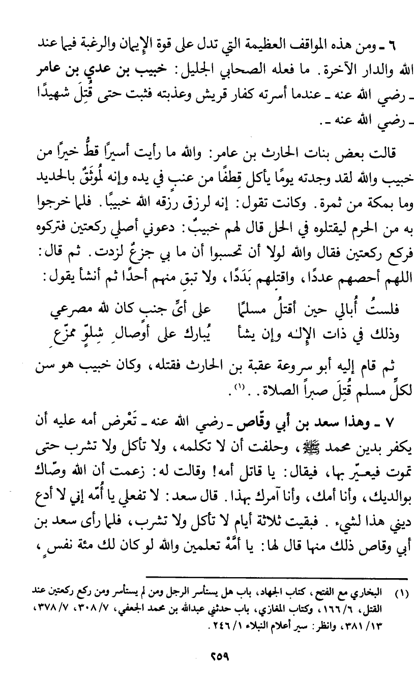 7 - وهذا سعد بن أبي وقّاص - رضي الله عنه - تَعْرض أمه عليه أن يكفر بدين محمد صلى الله عليه وسلم، وحلفت أن لا تكلمه، ولا تأكل ولا تشرب حتى تَموت فيعيّر بها، فيقال: يا قاتل أمه، وقالت له: زعمت أن الله وصّاك بوالديك، وأنا أمك، وأنا آمرك بهذا. قال سعد: لا تفعلي يا أُمّه إني لا أدع ديني هذا لشيء. فبقيت ثلاثة أيام لا تأكل ولا تشرب، فلما رأى سعد بن أبي وقاص ذلك منها قال لها: يا أمَّه تعلمين والله لو كان لك مائة نفس،